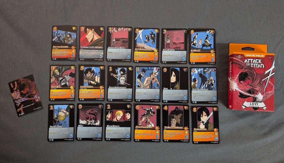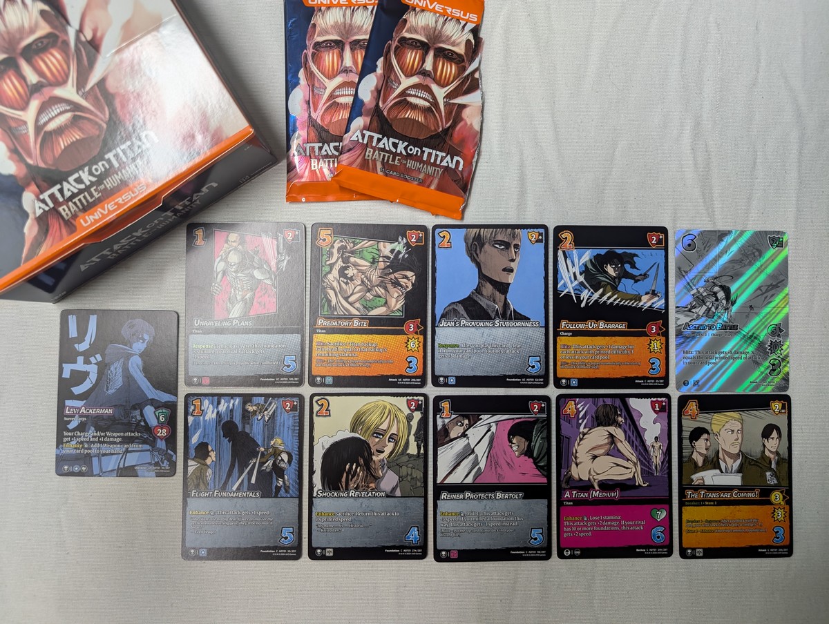 The UniVersus Attack on Titan: Battler for Humanity boosters consist of 11 cards each, including 1 character card, 6 common cards, 3 uncommon cards, and a card that could either be Rare, Ultra Rare, or Secret Rare. Beloved characters have their character cards, focusing on their particular strengths.