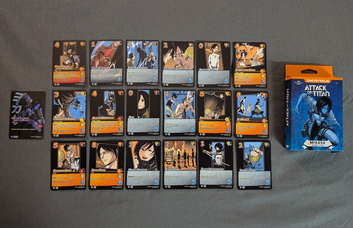 In collaboration with Kodansha, the publishing company UniVersus unveiled the new Attack on Titan: Battle for Humanity, featuring a new booster set, Clash Decks, and the Challenger Series, all set to launch on August 16th, 2024, marking this as the biggest set ever to be released by UniVersus. Mikasa and Levi are featured in the new Clash Decks, while Eren takes over the Challenger Series.