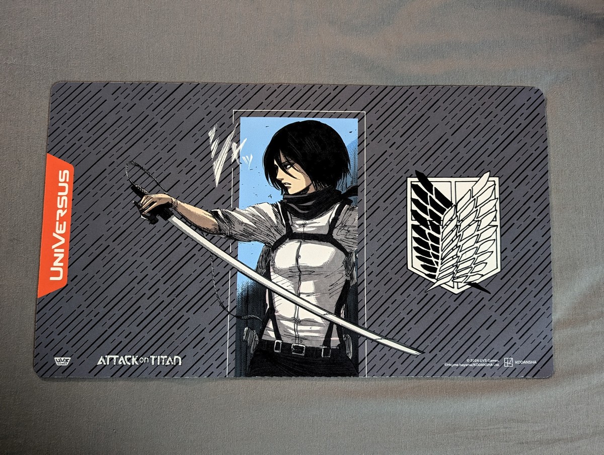 Also, be sure to check out the Attack on Titan: Battle for Humanity playmat: Mikasa Ackerman also available for purchase. Playmat measures 24″ x 24″ for gameplay space.