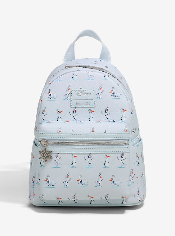 Loungefly Disney Frozen Olaf Mini Backpack has the lovable Olaf printed all over being his silly self. Its dimensions are 8″ x 5″ x 10 1/4″.