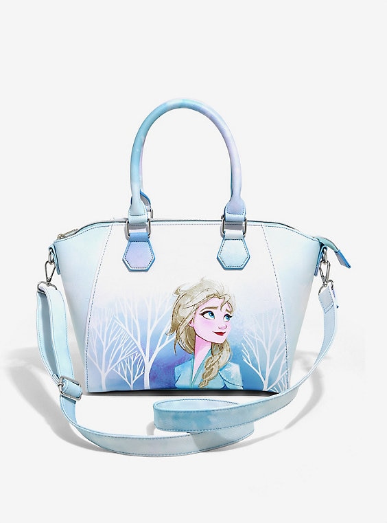 Loungefly Disney Frozen 2 Elsa Satchel Bag is faux leather, and the satchel strap is detachable and adjustable. The back says “Destiny Awaits.” The dimensions are 10 3/4″  x 6″ x 10″.