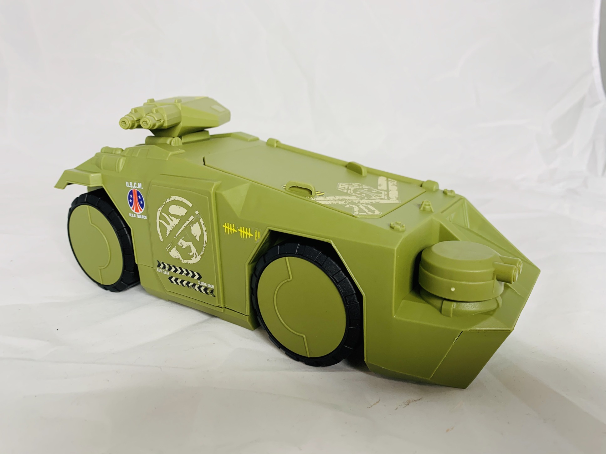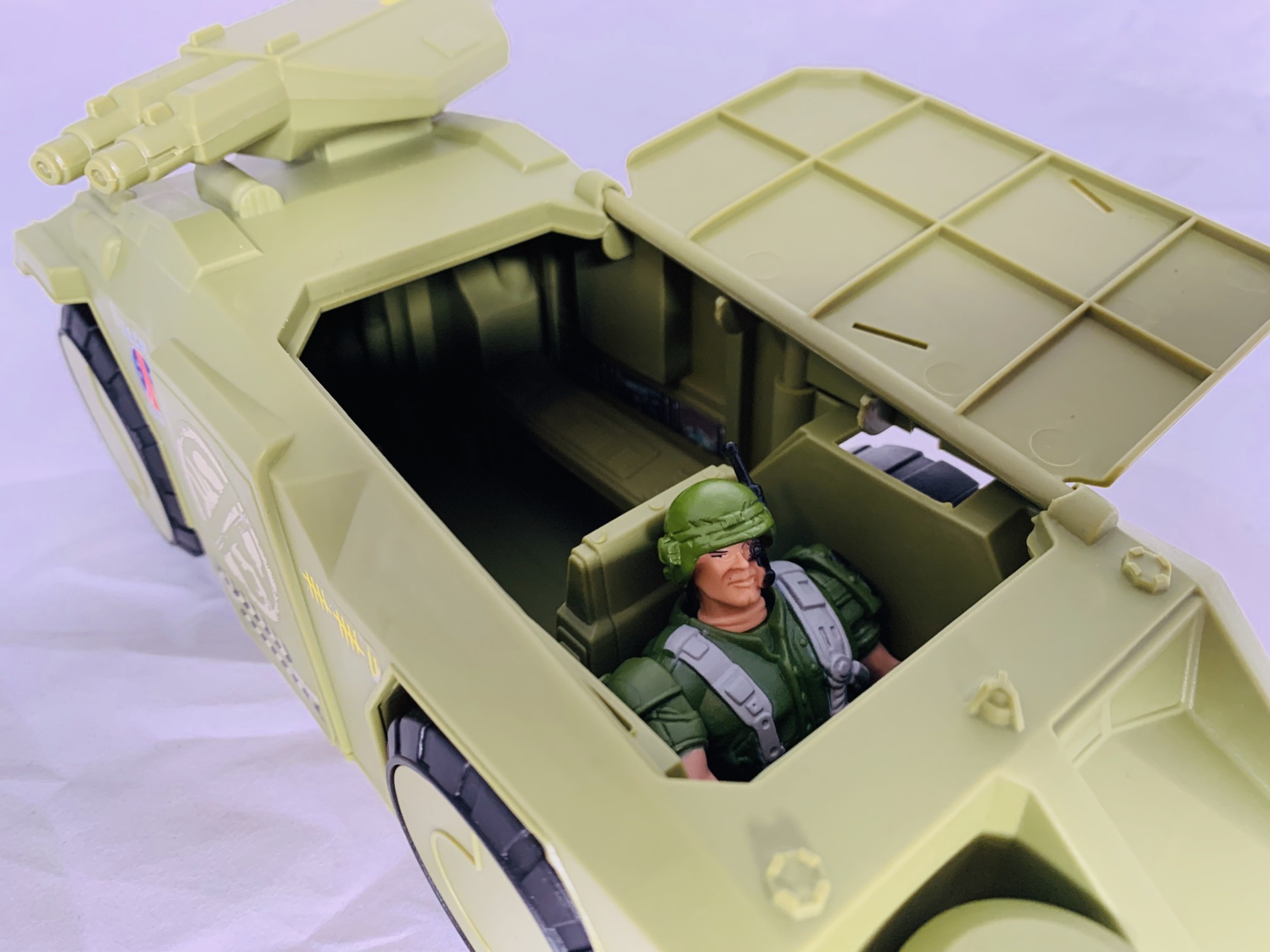 The vehicle itself has an opening cockpit that fits two action figures, two mounts guns that can rotate and the ability to roll on its wheels.