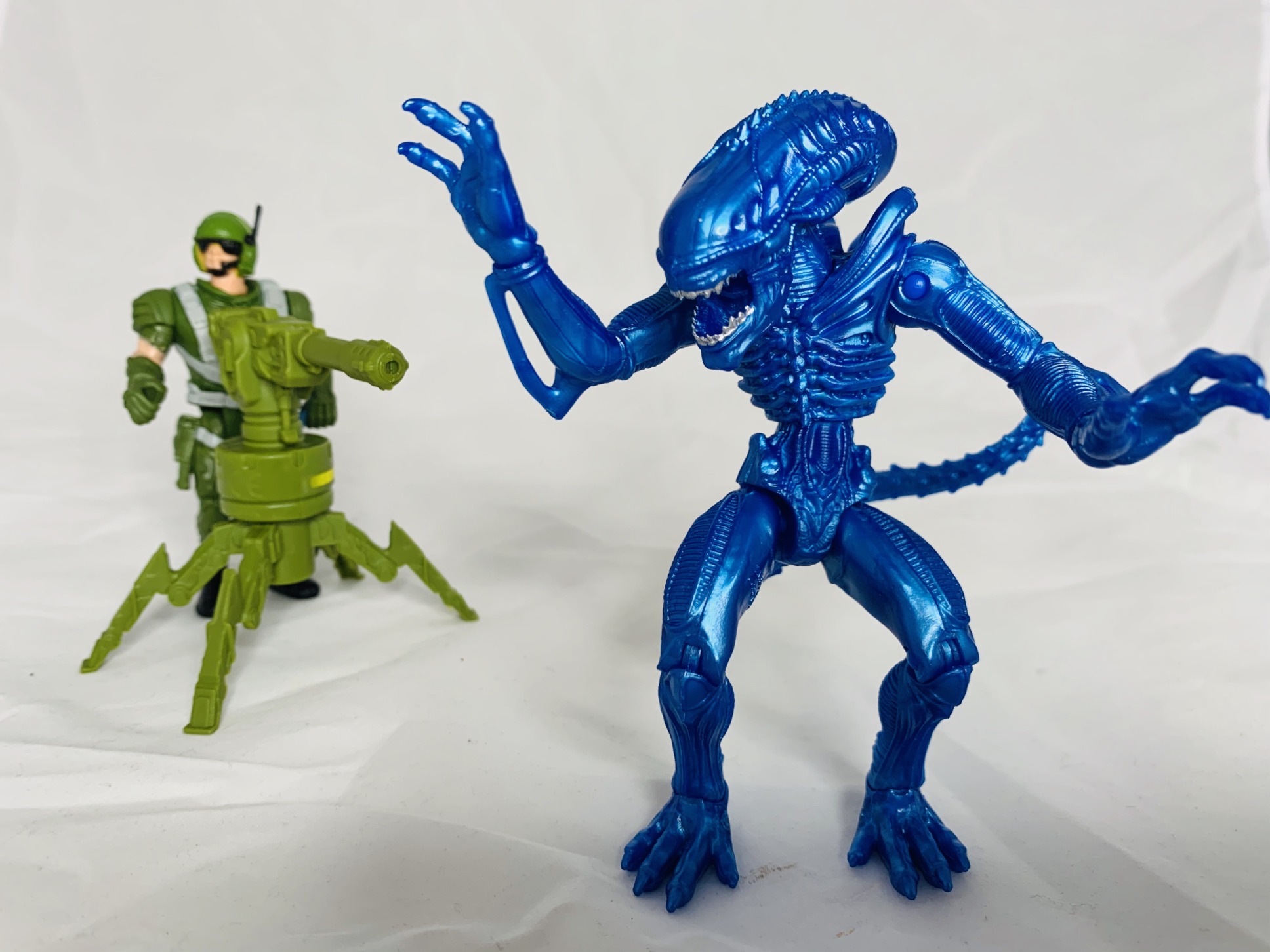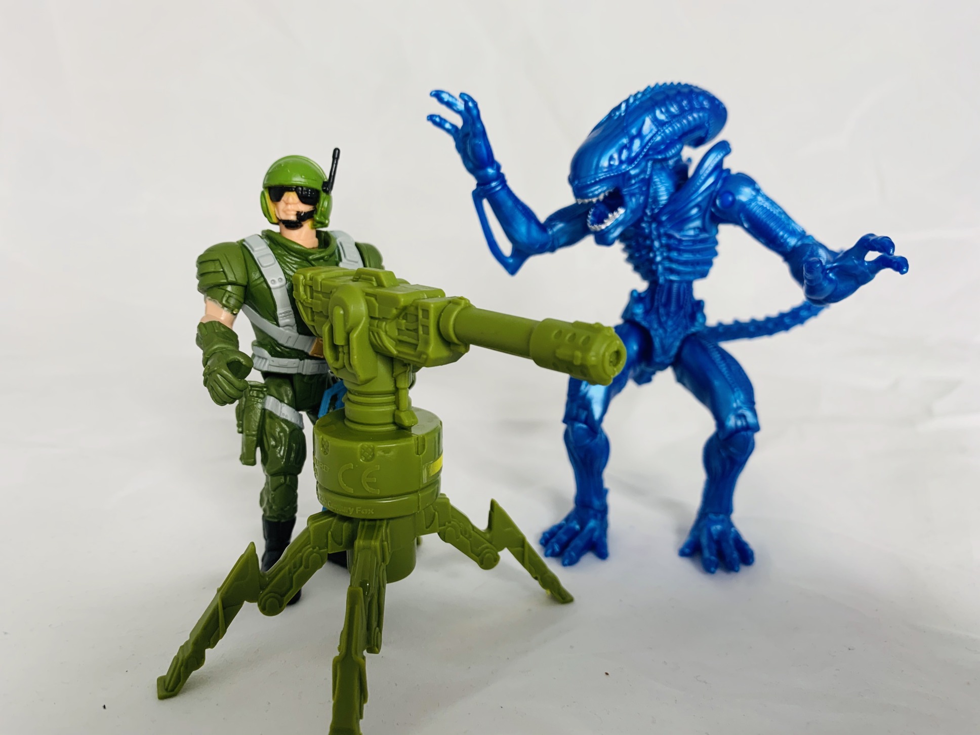 The third set comes with Xenomorph Warrior, mounted cannon, and Marine Figure. The Space Marine only has five points of articulation while the Xenomorph Warrior has 13 points similar to the Drone action figure. The mounted cannon can swivel on its turret a full 360 degrees. The marine also has problems holding his rifle.