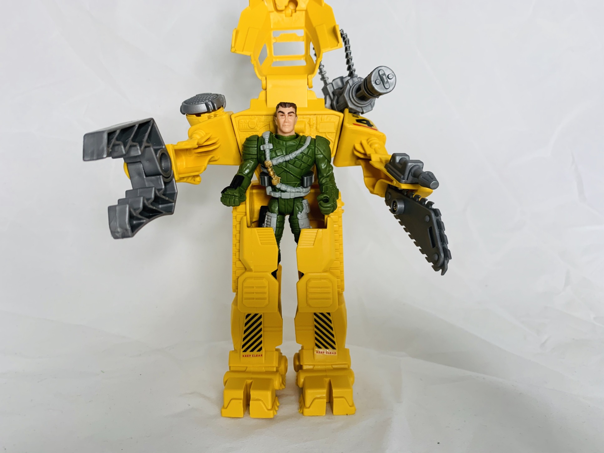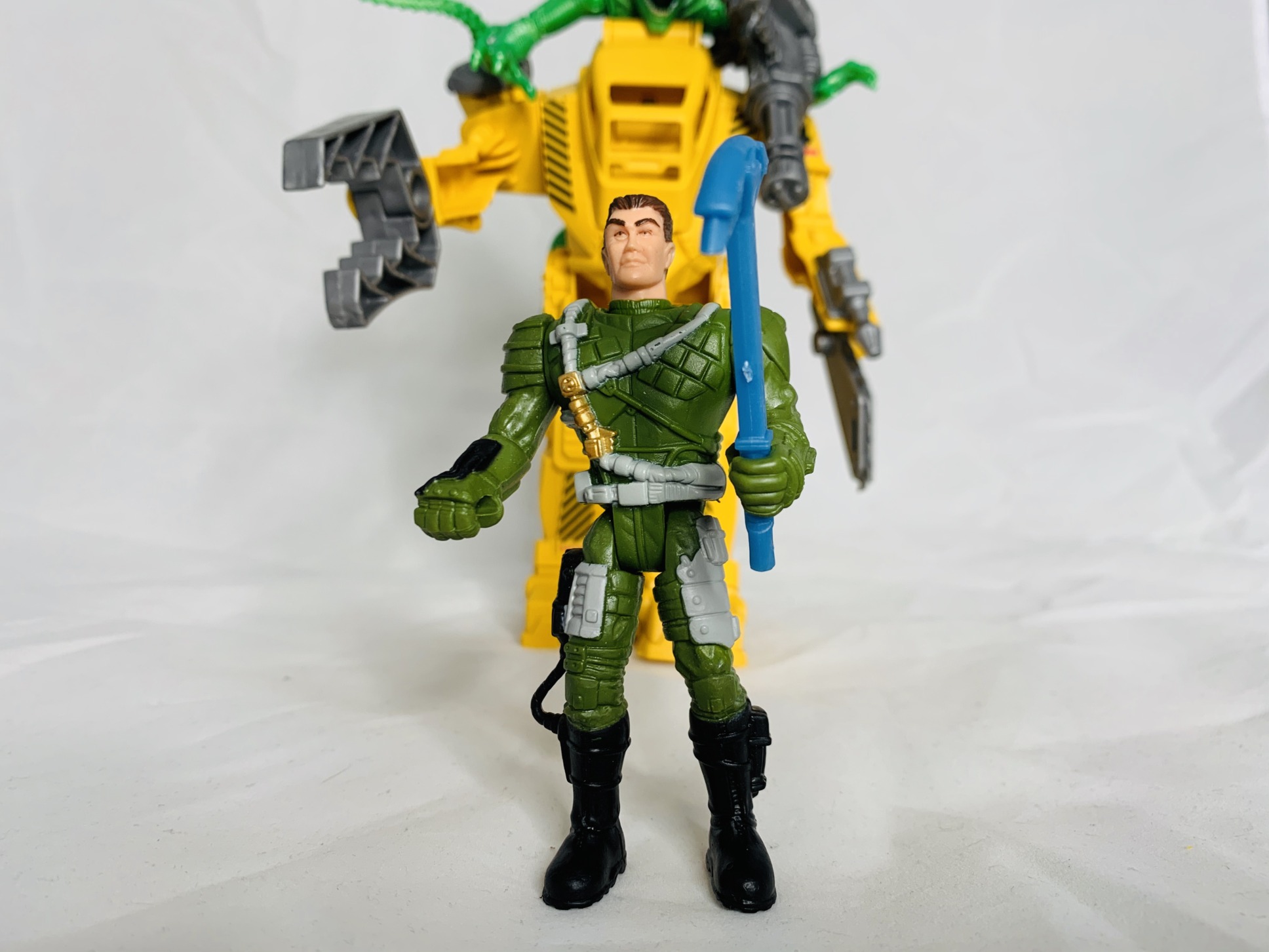 The marine can snap into his Super Power Loader to take on the Xenomorph. This vehicle has a figure loading canopy, rotating mini-gun and a claw that opens and closes. it has 6 points of articulation (including gun). The marine also has an included pickax.