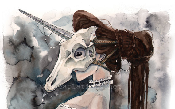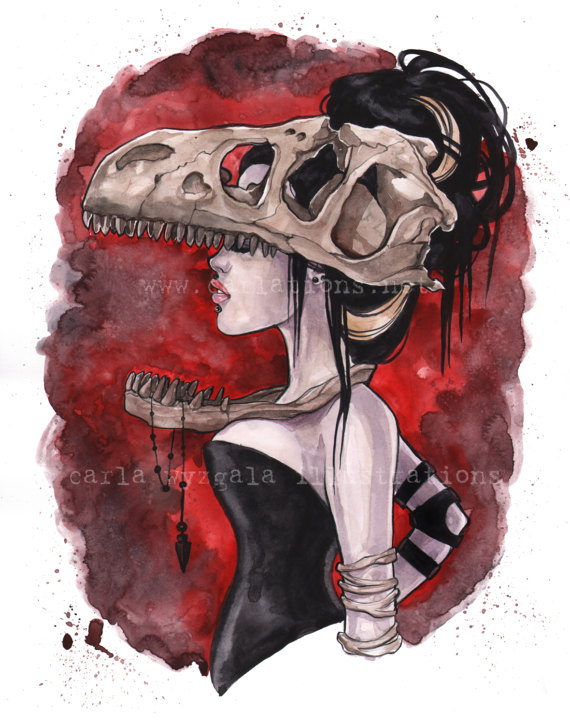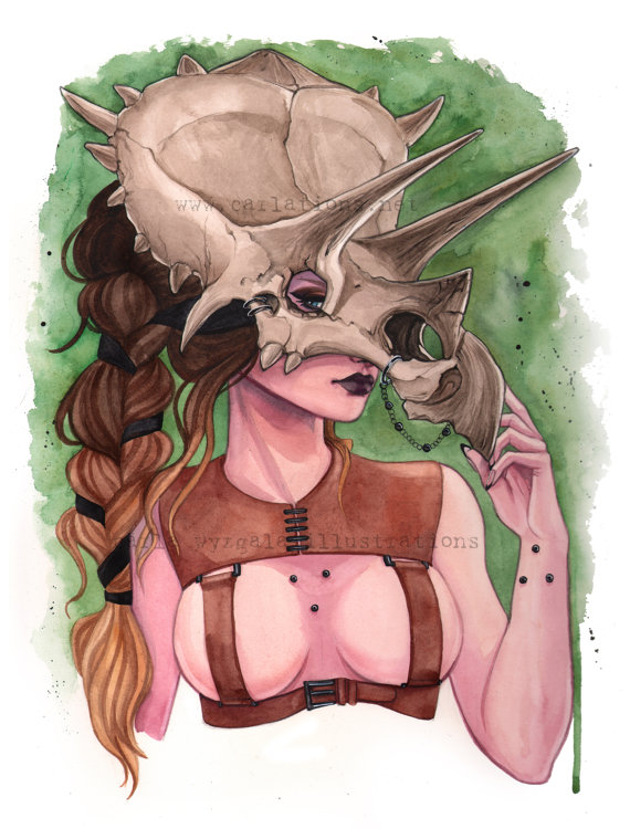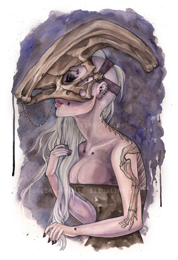 I frequented the Field Museum when I lived in Chicago and there is something about a room full of bones that makes me want to draw. It’s almost therapeutic to study the cracks and dimensions of the skulls. Since my art is all things pretty ladies, I had to figure out a way to put a girl in there, so I literally just put a girl in there. I’ve always loved masquerades as well as designing dresses, so it all came together. Thank The Labyrinths’ “As the World Falls Down” for putting images in my head! And they are extremely uncomfortable to wear, so I’ll stick to just designing them.