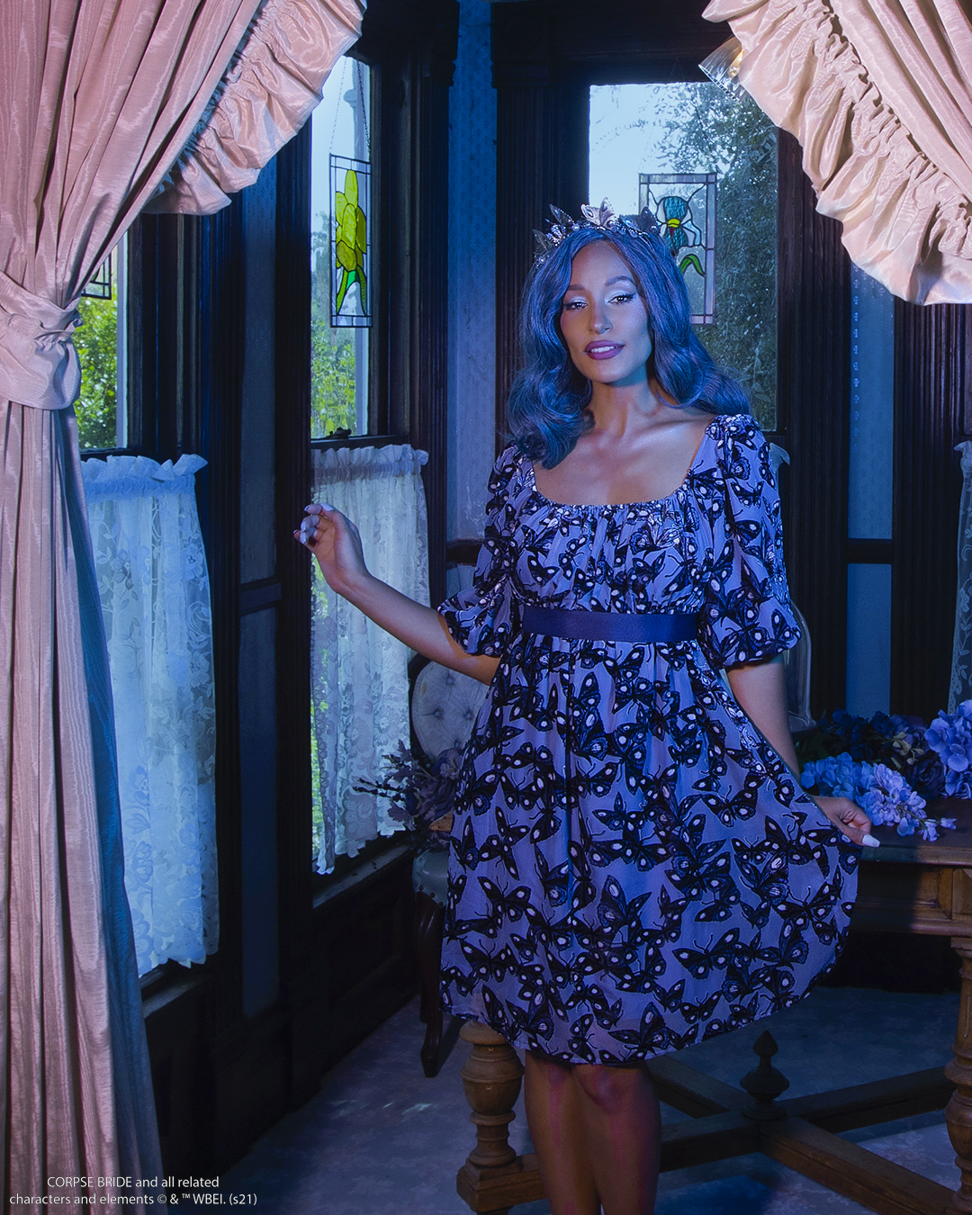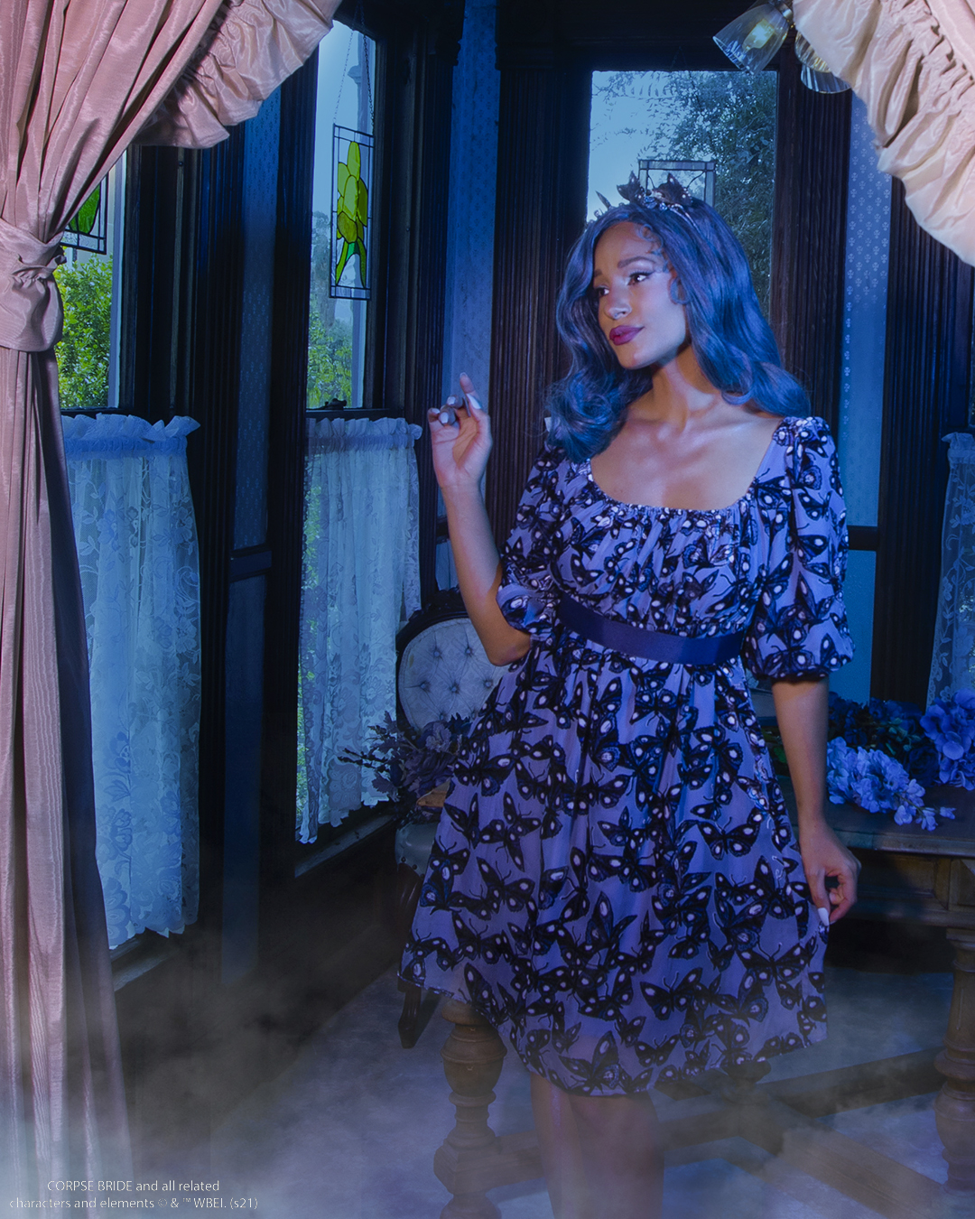 Gothic romance comes alive in this custom-designed melancholy blue burnout babydoll dress. Featuring a delicate butterfly print that is inspired by Emily’s transformation from the film. This sweet and demure dress hits above the knees, with an empire waist and a shirred bodice.