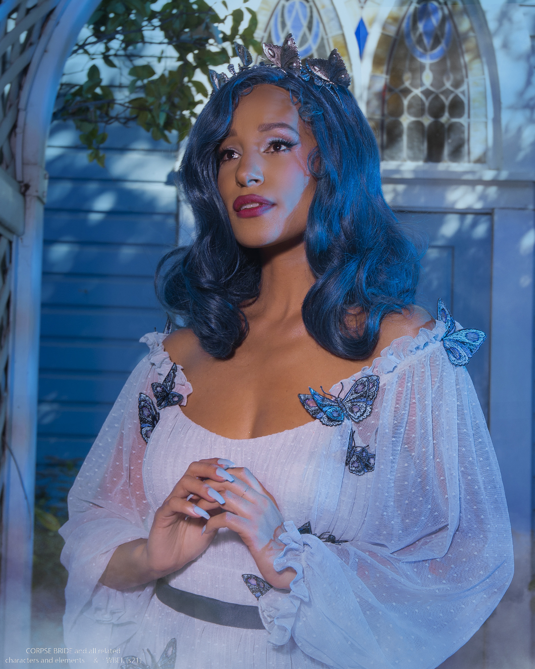 Gothic romance comes alive in this custom-designed melancholy blue burnout maxi dress. Featuring a delicate butterfly print that is inspired by Emily’s transformation from the film. Flutter sleeves drape over spaghetti straps and the skirt is full length with an A-line sweep.