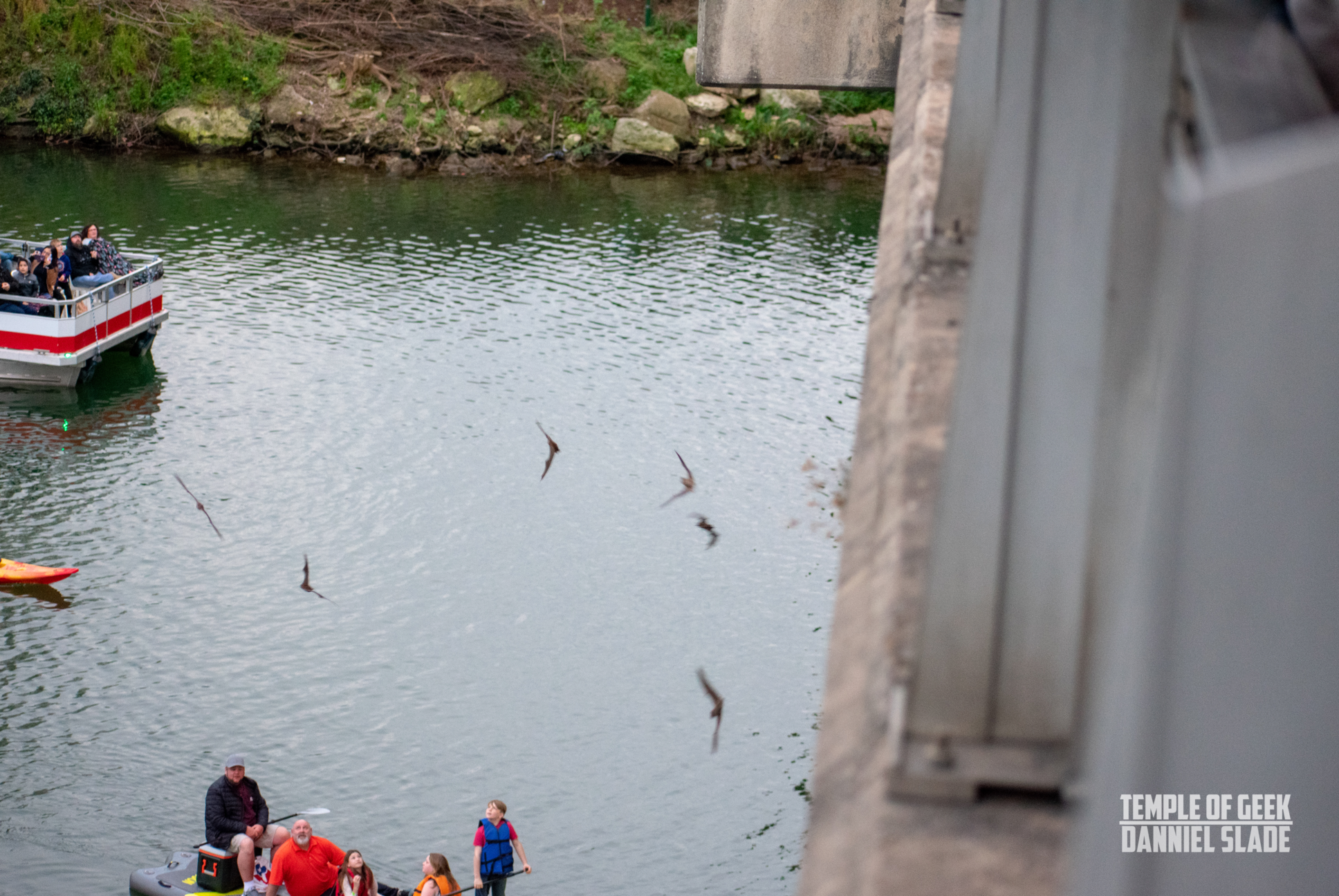 The celebration continued at the Ann W. Richards Congress Avenue Bridge to witness the bats of Austin Texas take flight. DC Comics handed out light-up bat-shaped glasses and photo props to the crowd for photo opportunities. The bridge was packed in anticipation for the nightly departure of the bats.