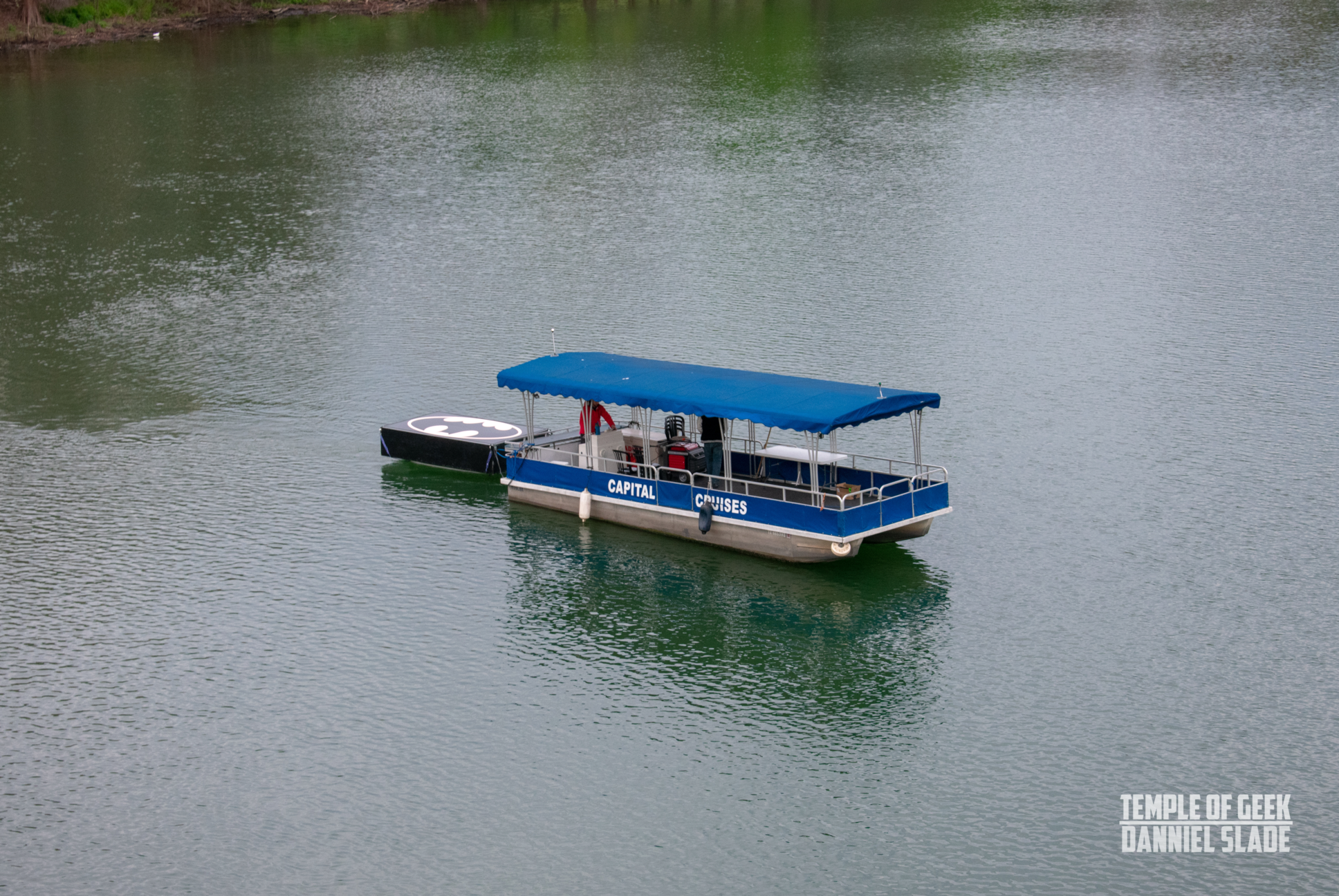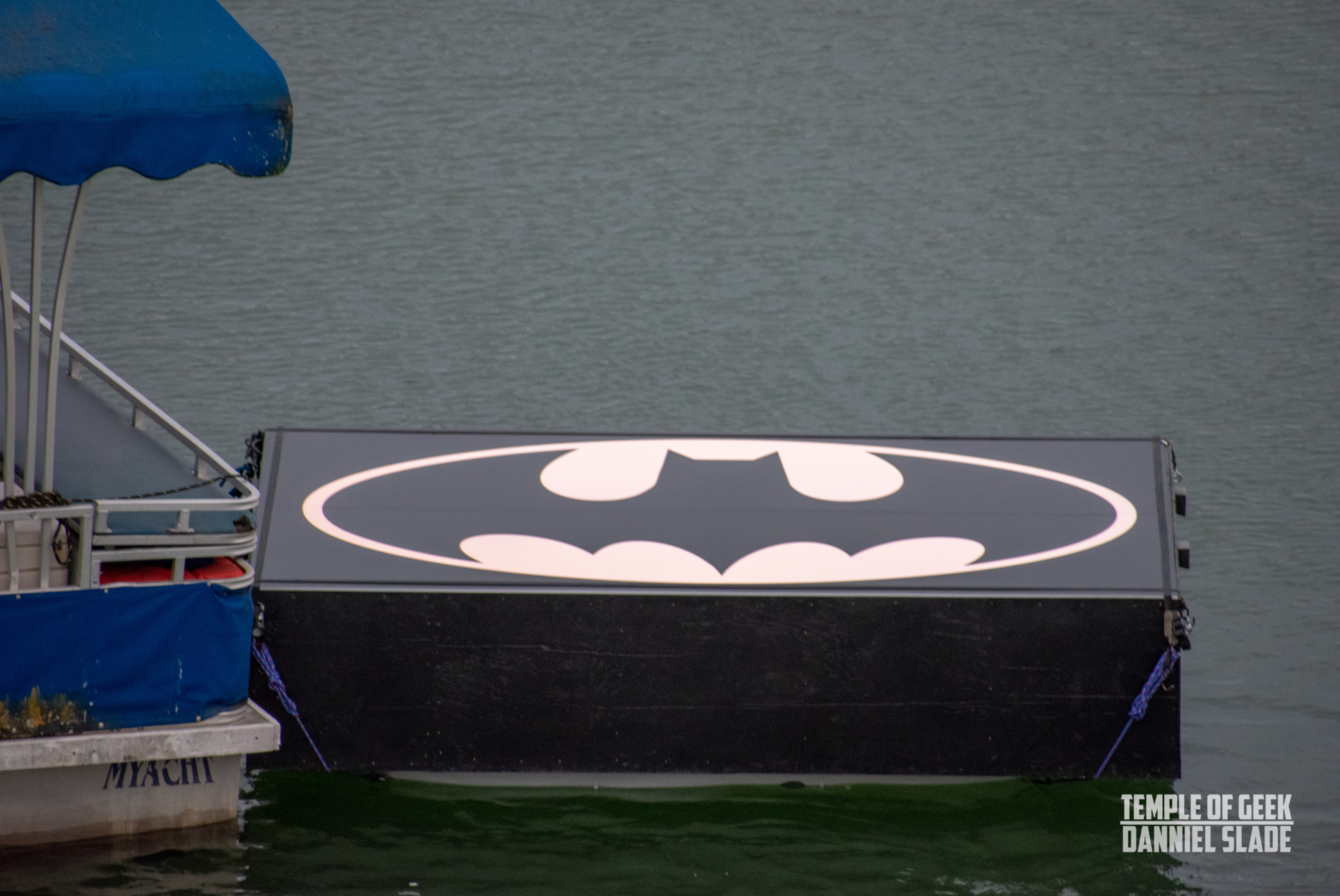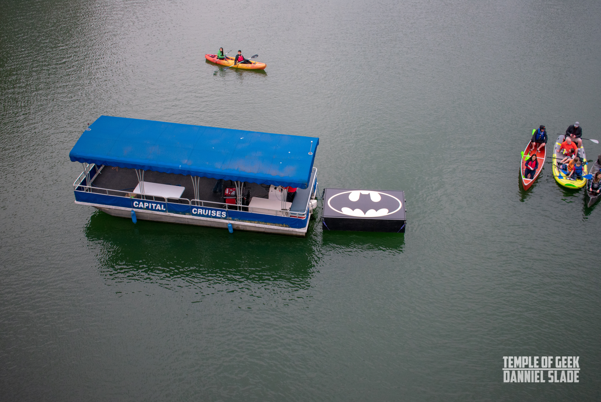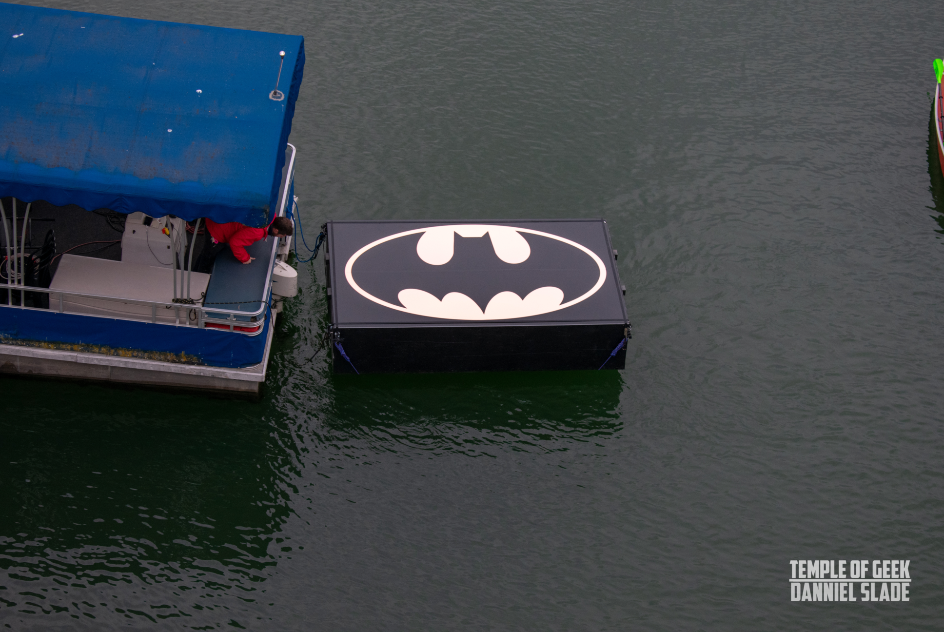 Not only was the bridge packed, but the ground and water were packed with observers patiently awaiting as well. There was even a light-up batlogo brought out to the water to firmly place Batman’s stamp on the event.