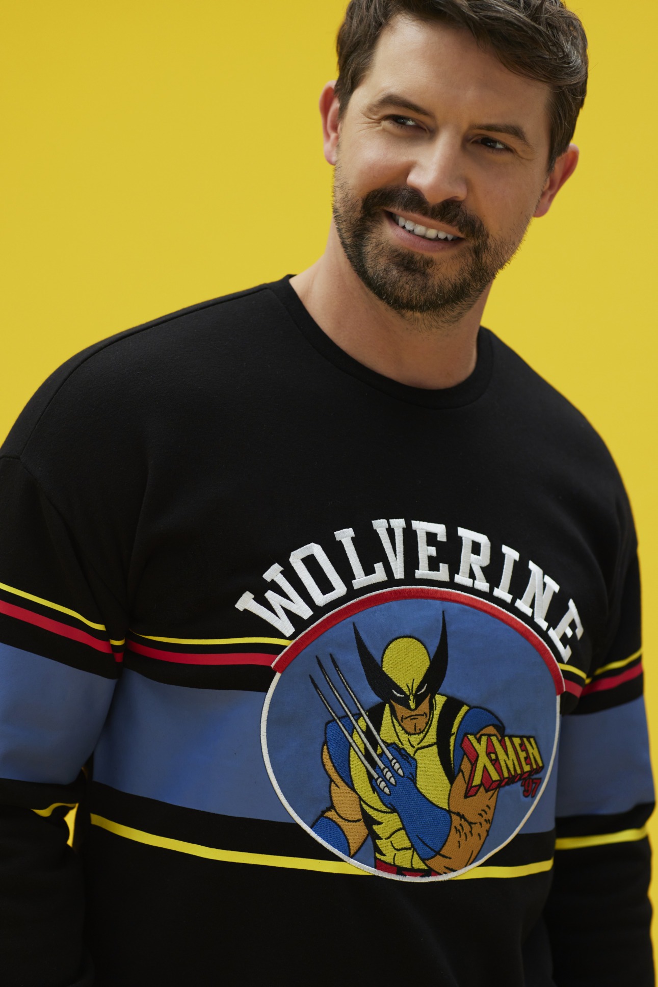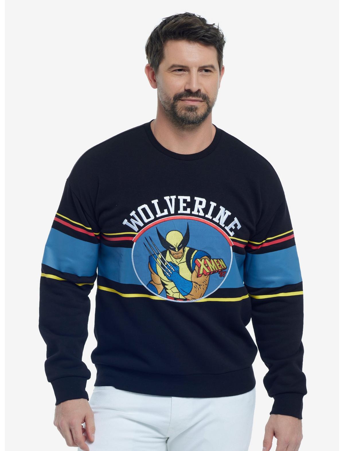 This sweatshirt features an embroidered portrait of Wolverine, complete with his name in bold lettering. Classic striped details add a touch of nostalgia. Made with a comfy blend of 52% cotton and 48% polyester, this crewneck comes in unisex sizes for a relaxed fit.