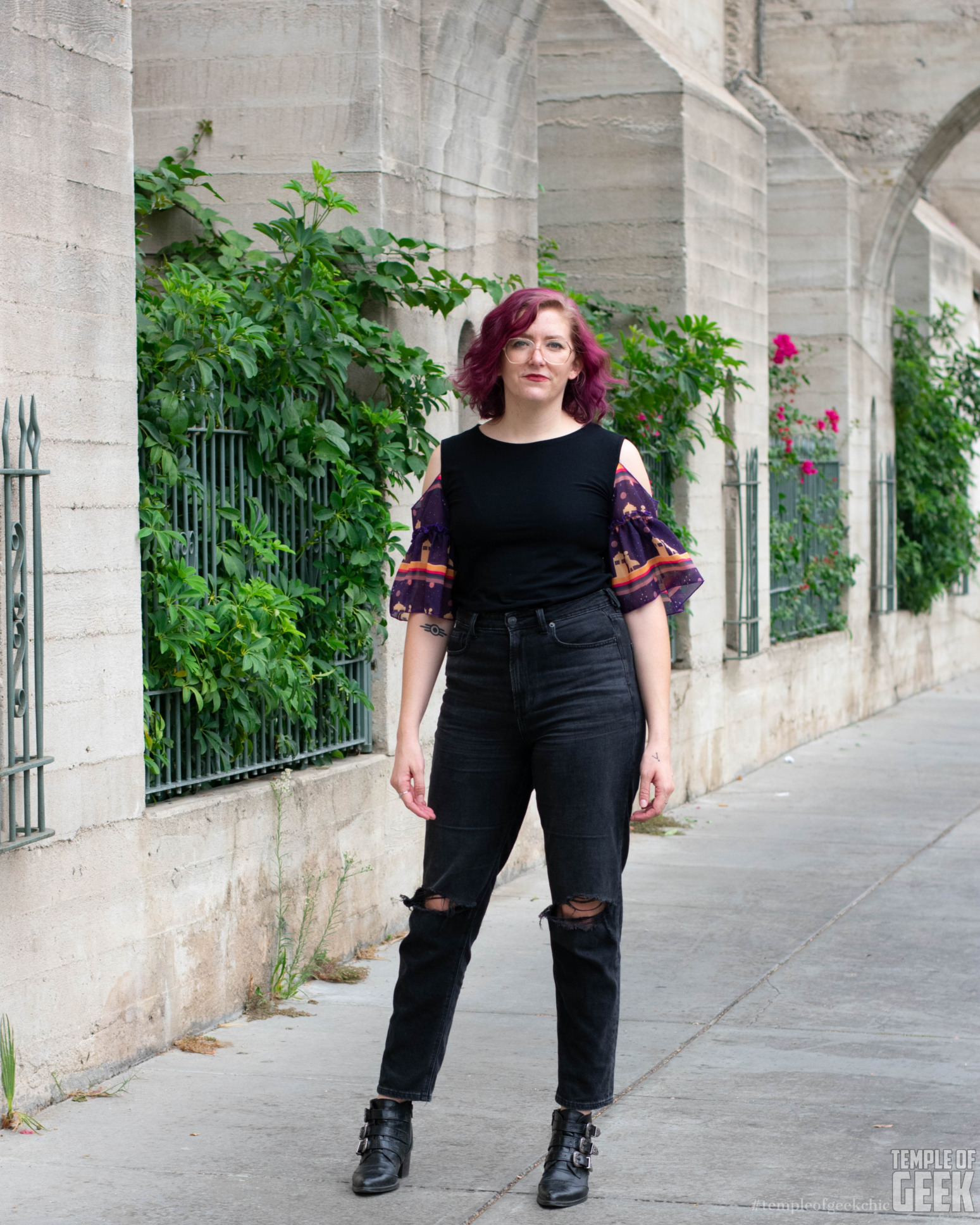 Soft and flirty, this cold shoulder-style top is light and comfortable. The feathery, ruffled sleeves are soft and silky. The design is elegant and subtly geeky. The colorful print on the poly chiffon sleeves looks lovely in contrast to the plain, black knit bodice. You could easily dress this top up with a skirt or stylish pants, or pair it with jeans for a casual look. This piece is understated and classic but makes a bold, geeky fashion statement.