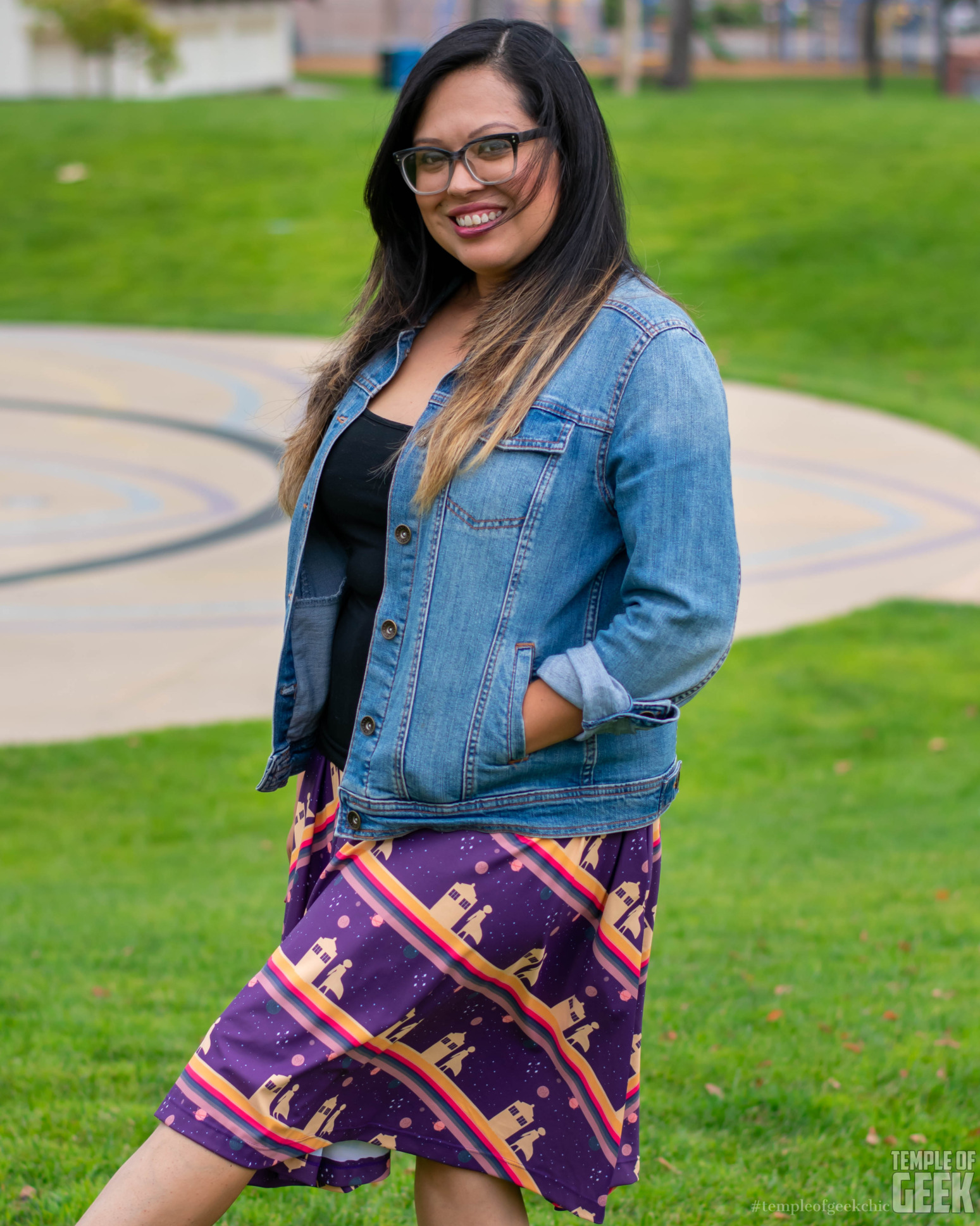 This skirt is fun to wear, thanks to its gorgeous purple and brightly patterned print. It’s flowy and has a classic feel and fantastic twirl to it. The hem tends to hit just below the knee. The fabric is cool and sleek. The stretchy, elastic knit waistband provides extra comfiness. Hidden seam side pockets had us fangirling hard.