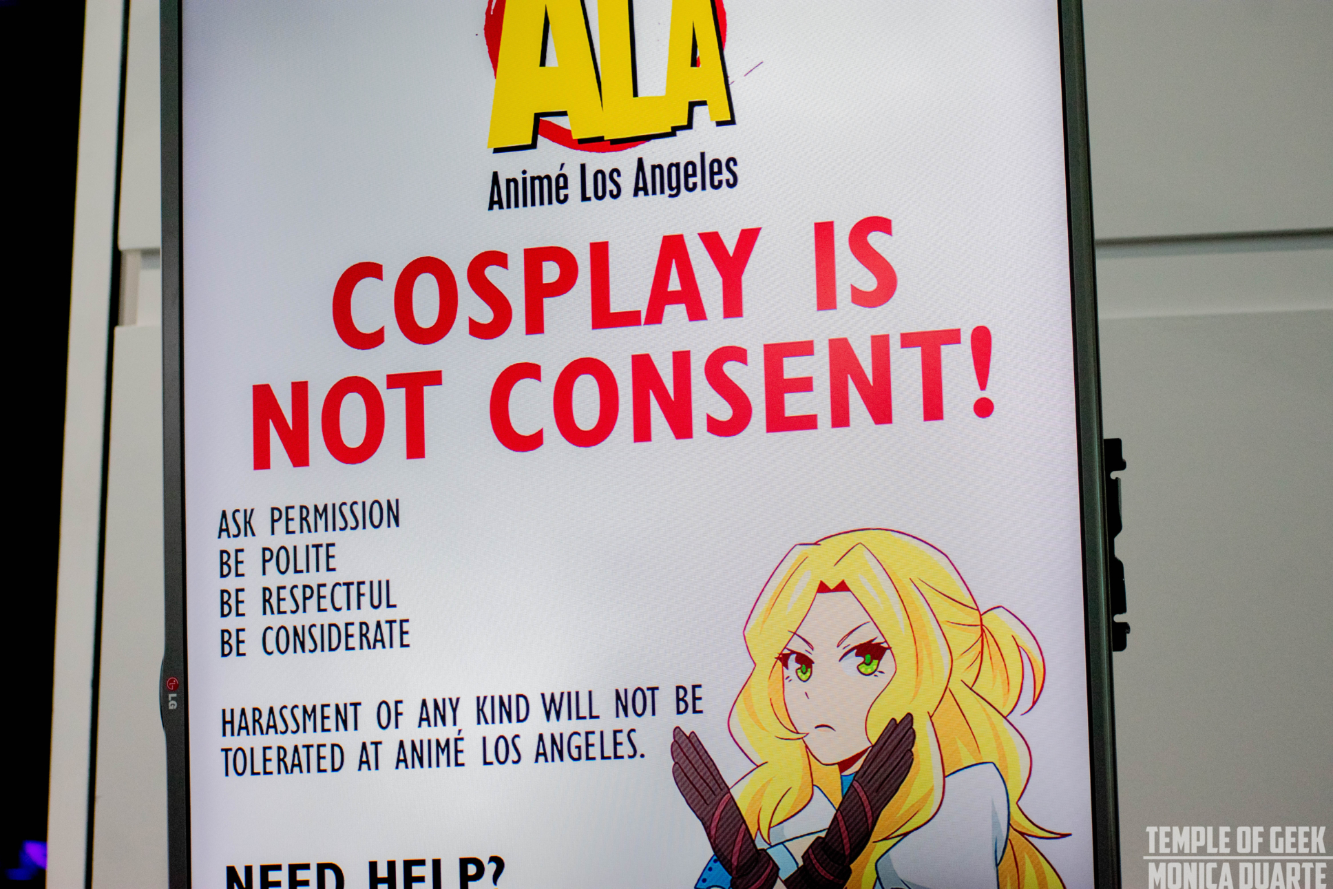 We caught up with cosplayer Angi Viper at Anime Los Angeles and talked with her about “Cosplay Is Not Consent”. Cosplay is a play on the words Costume and Play. It is usually used to refer to people who dress up as characters from geek and nerd culture. Cosplay is a unique and very personal form of expressing yourself. Every cosplayer is unique and they cosplay for their own reasons. Because of unique experiences and situations that each cosplayer goes through “Cosplay Is Not Consent” can mean different things to different cosplayers. It is a phrase that you see posted on banners at almost all pop culture conventions and something that comes up a lot in the cosplay community. It speaks to the sentiment that while cosplayers may go to conventions in order to showcase a new costume they are still to be respected. Especially when it comes to unwanted sexual advances.