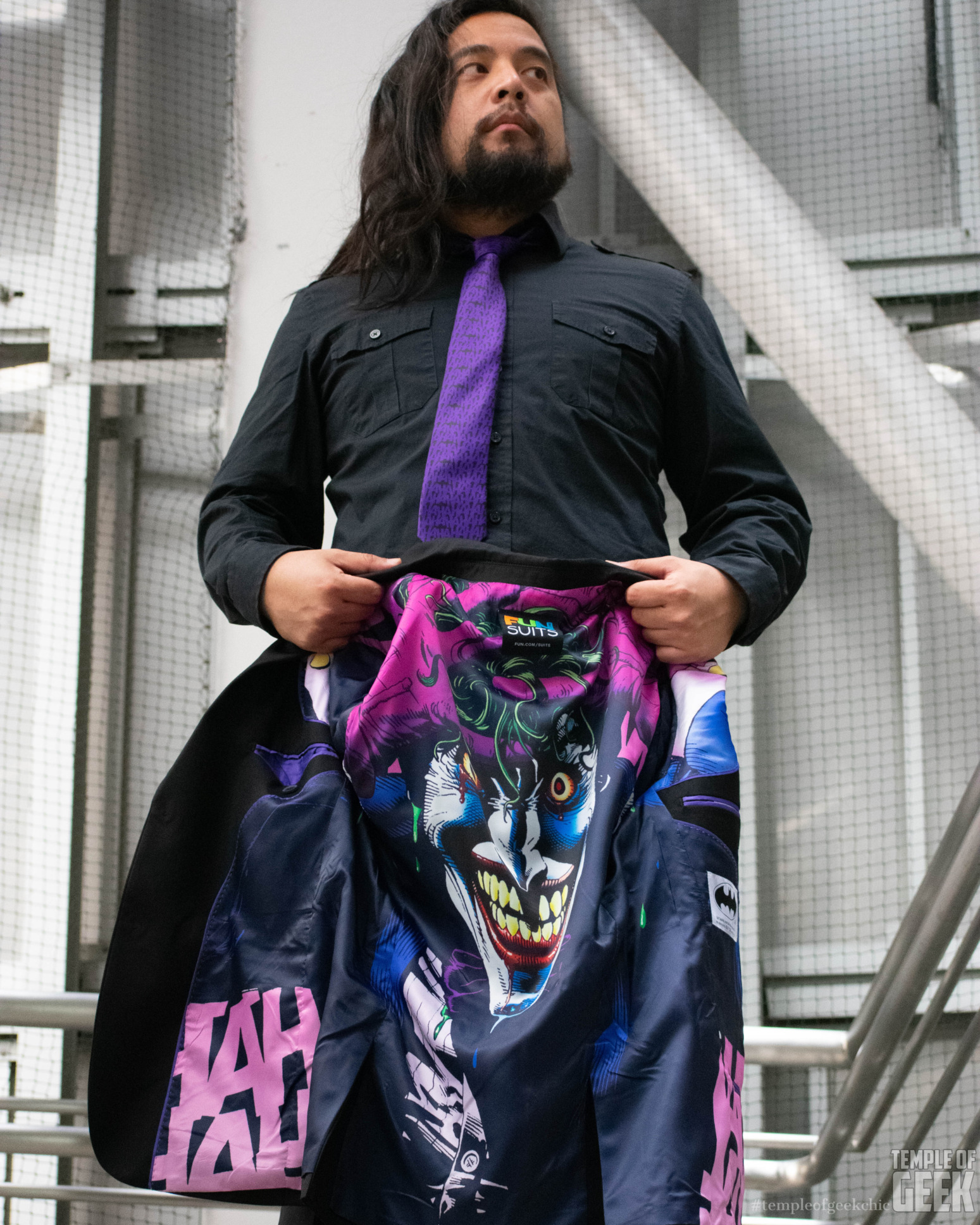 If you’d like to add more geekiness or a pop of color to your outfit, the jacket comes with a matching tie and pocket square. Both the skinny tie and square are a satiny black, covered in purple, comic book-style “Ha ha ha’s.”