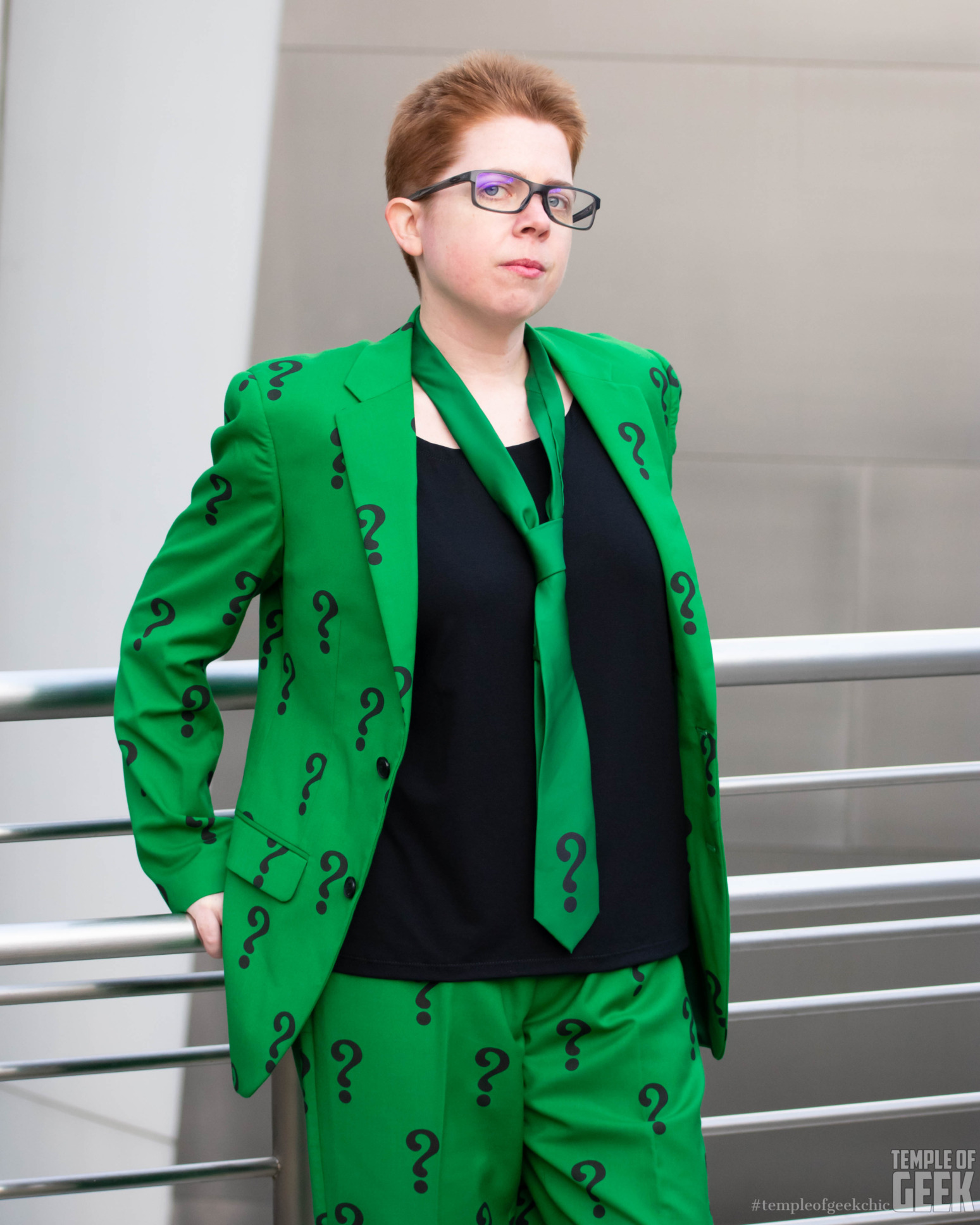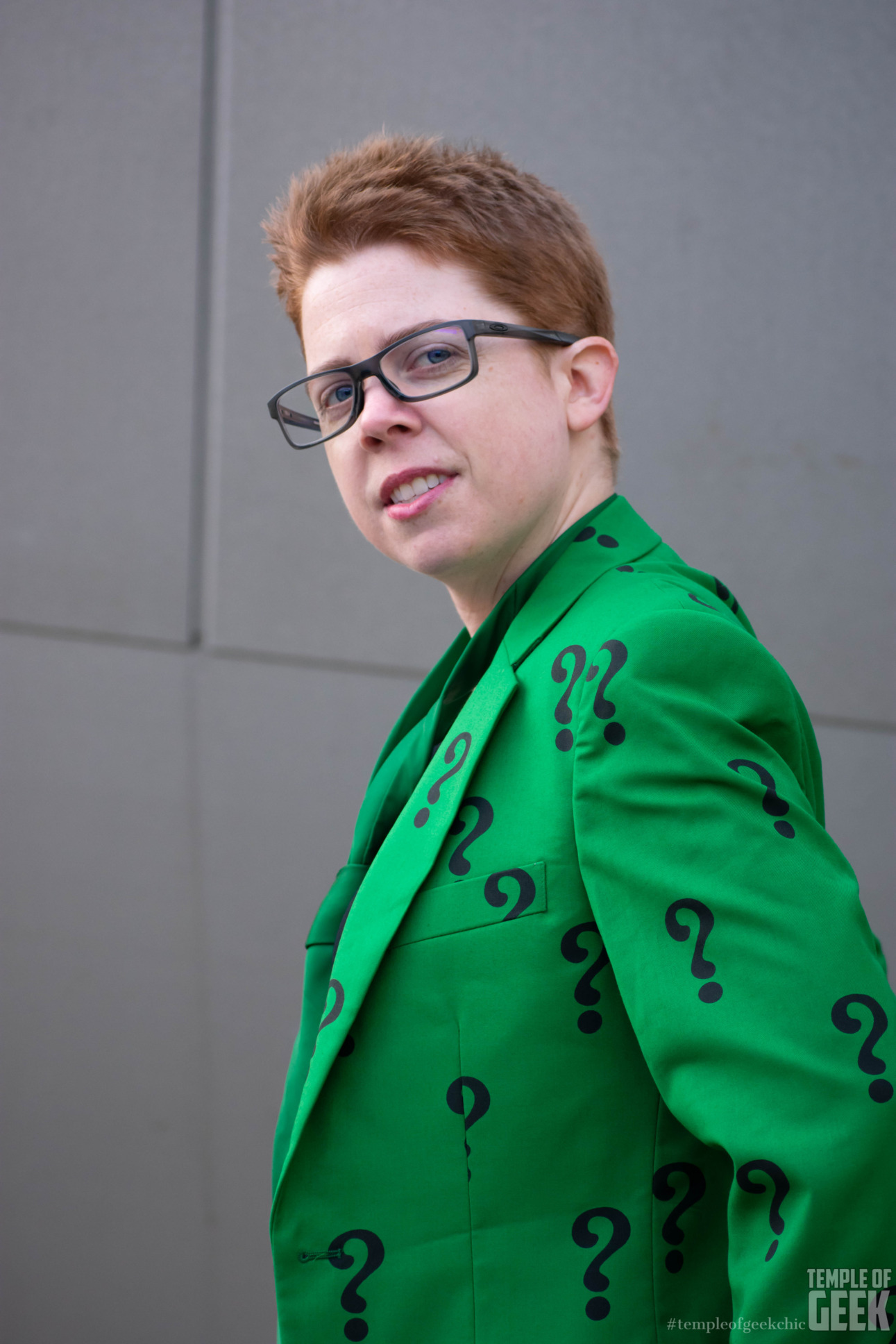 Our model, Kelsey, had way too much fun sporting this eye-popping DC villain-themed outfit. The bright green background is covered neck to ankle in audacious black question marks. Inside the jacket is a silky, deeper green lining with the official Batman label sewed in. It tapers at the waist for a tailored look, further accentuated by shoulder pads.