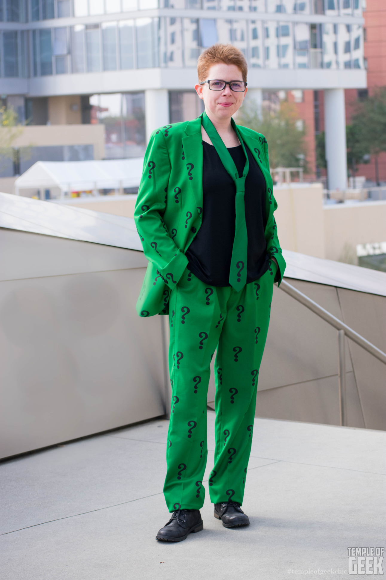 Once again, this suit is a slim fit, so prepare for snugness. The jacket comes with a matching green skinny tie with a question mark at the bottom.