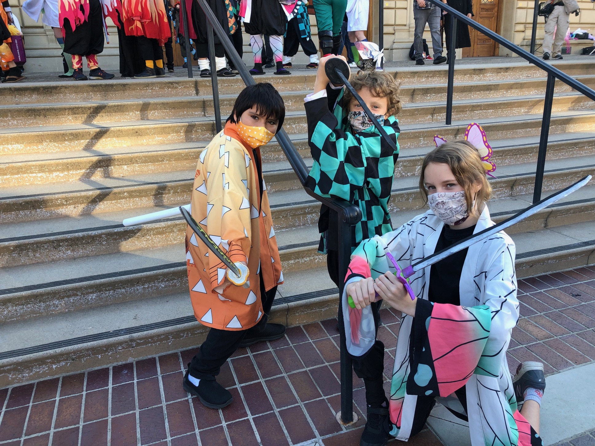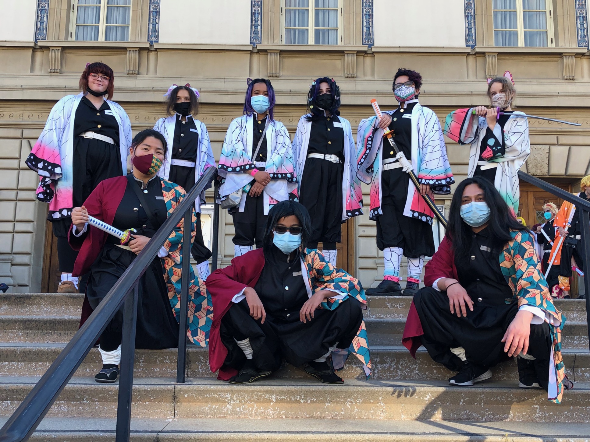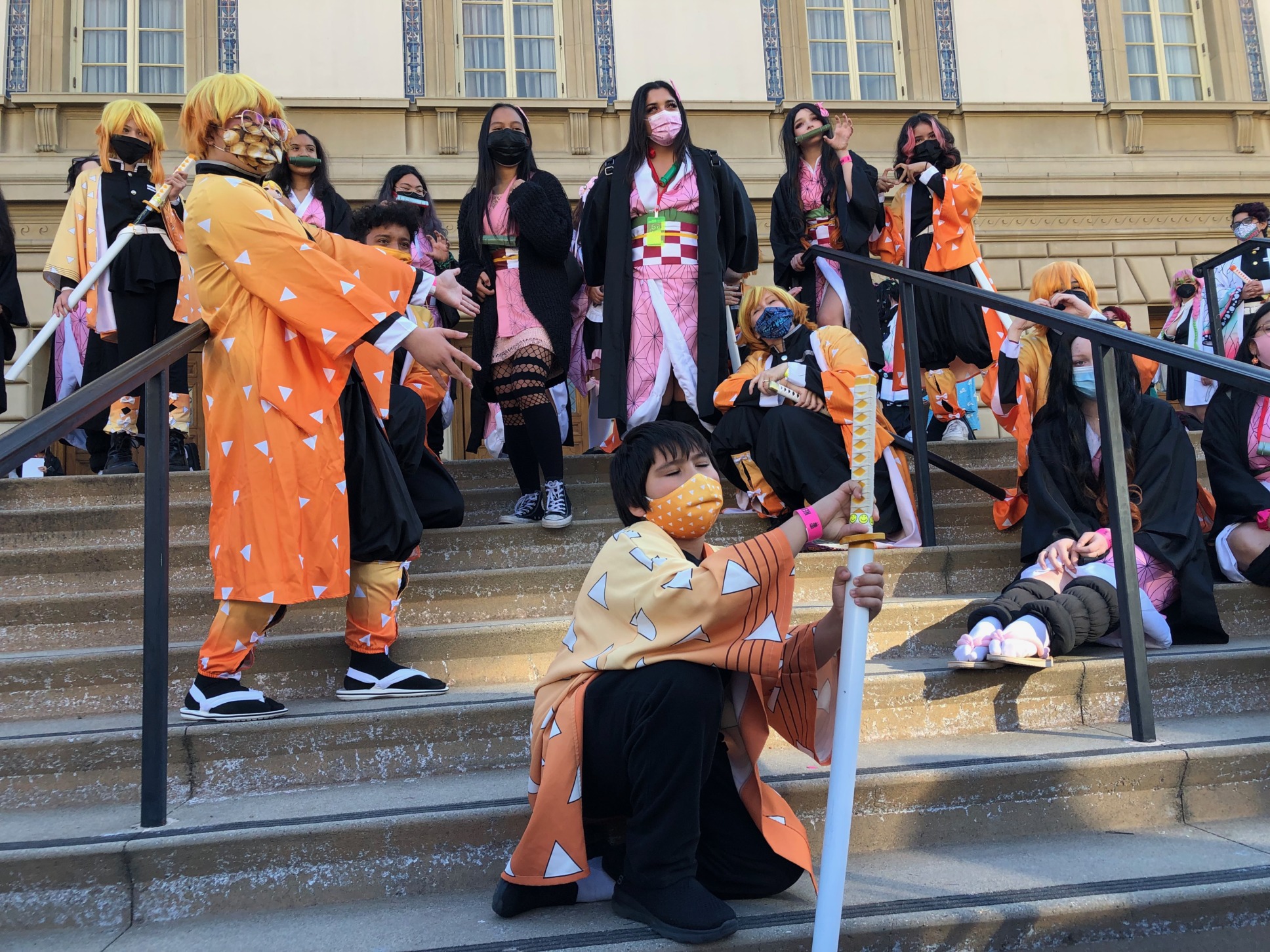 The meetup took place on the outside front steps of the Convention Center between the giant Pikachu and Grogu inflatables. The area provided lots of space to be socially distant. The vast majority of the gathered cosplayers wore masks as well. Some even specially matched them to their cosplays.