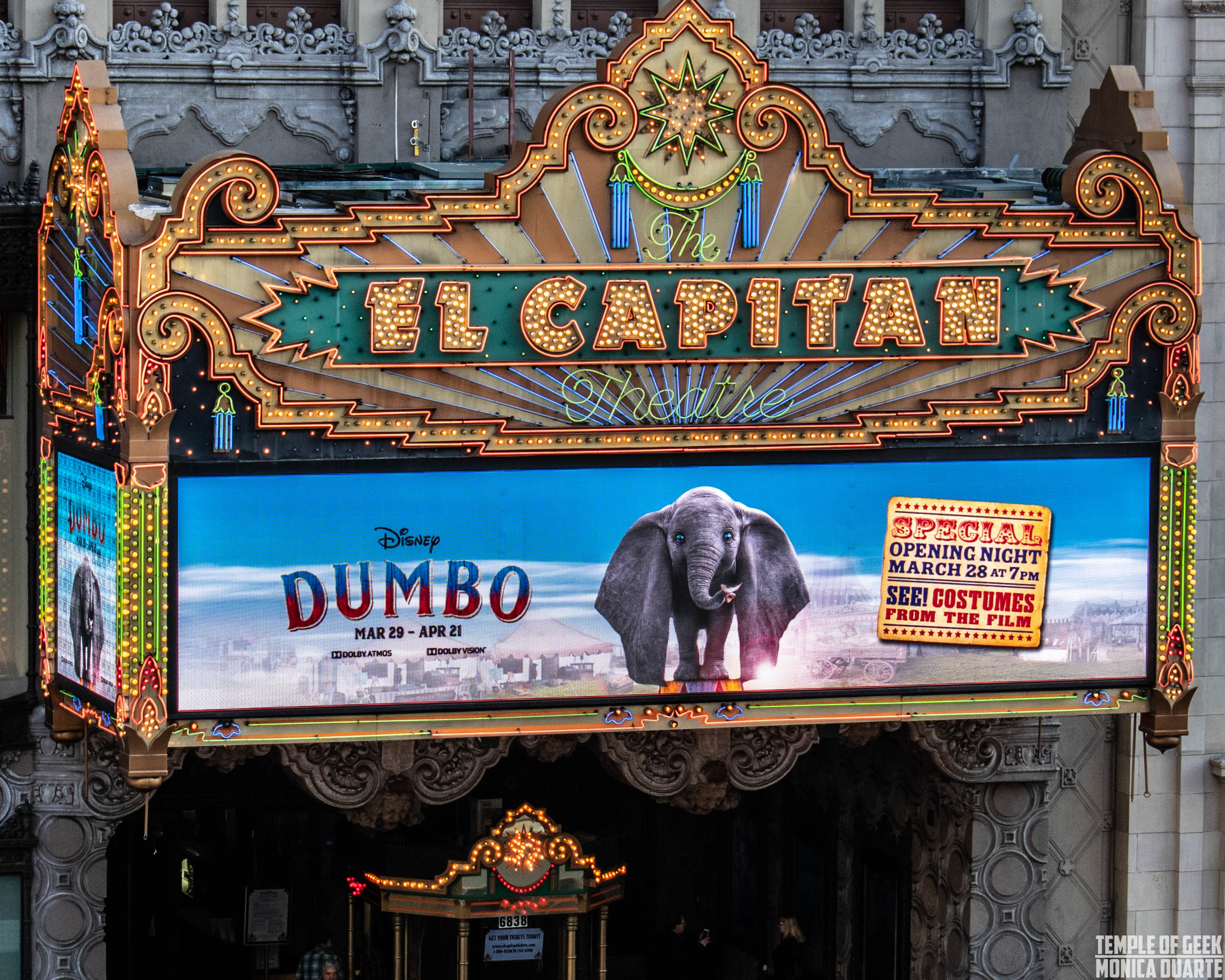 Disney’s DUMBO takes moviegoers on a grand live-action adventure. At the El Capitan Theather in Hollywood, CA you can watch the movie and check out the display of photo ops, costumes from the film and a live performance of circus arts before the movie starts! The El Capitan Theatre is a fully restored movie palace. The theater is filled old Hollywood charm and nostalgia. A perfect place to watch a film based on a classic 1940’s character.
