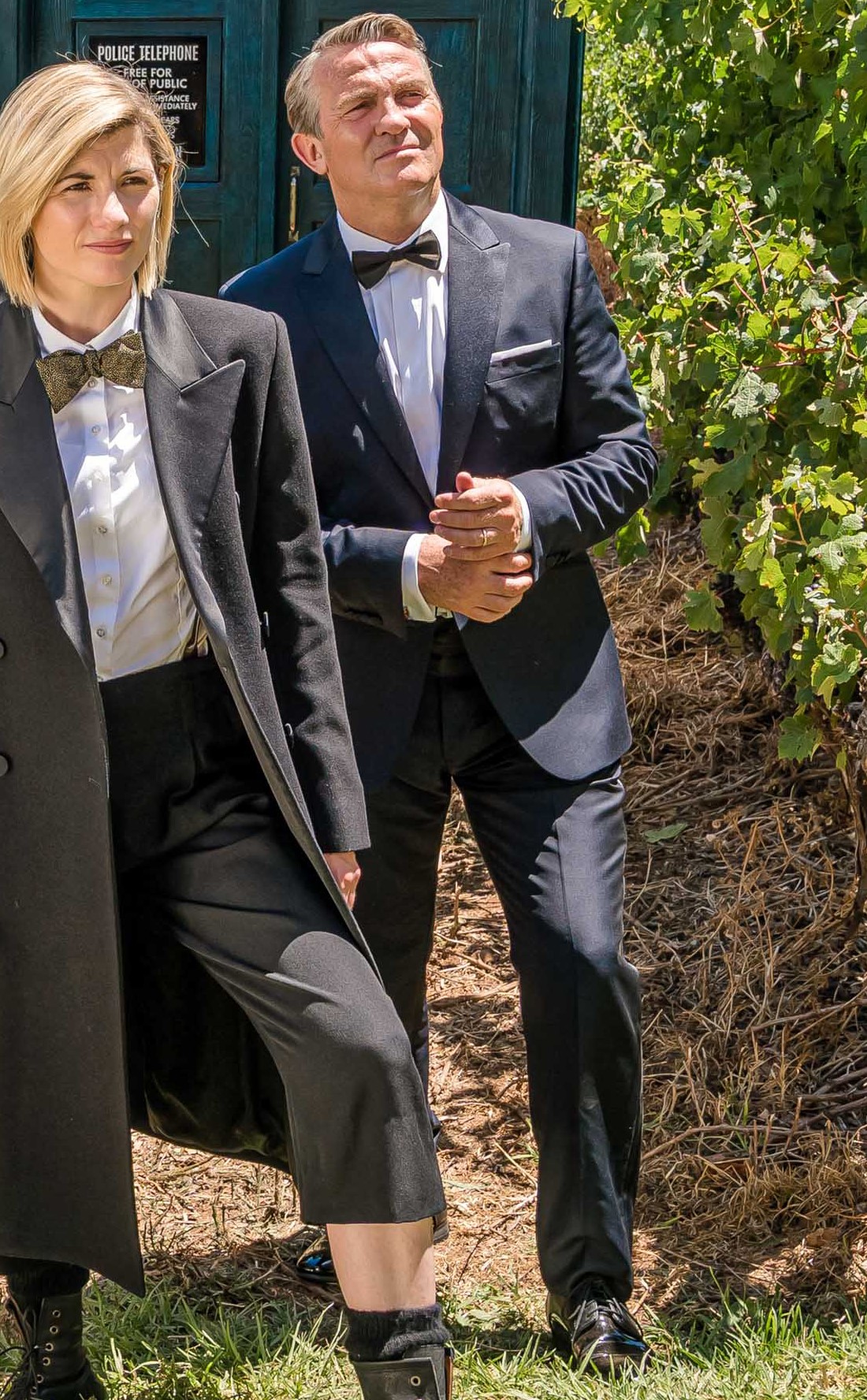 The Doctor and the gang are in a grape vineyard in tuxedo-style attire. The Doctor is noticeably wearing a new coat and bow tie, because—obviously—bow ties are cool AF. Her style is very similar to her original style from series 11. In this photo, she is wearing a long black coat, a white tuxedo shirt, black culottes, black socks, dark-colored military boots, and possibly suspenders. The rest of the team is in a more modern-style tuxedo. Is this possibly hinting that the team is attending a wedding or special event? Or maybe this season will just be a very James Bond style adventure? Either way, it makes for a cool-looking cosplay.