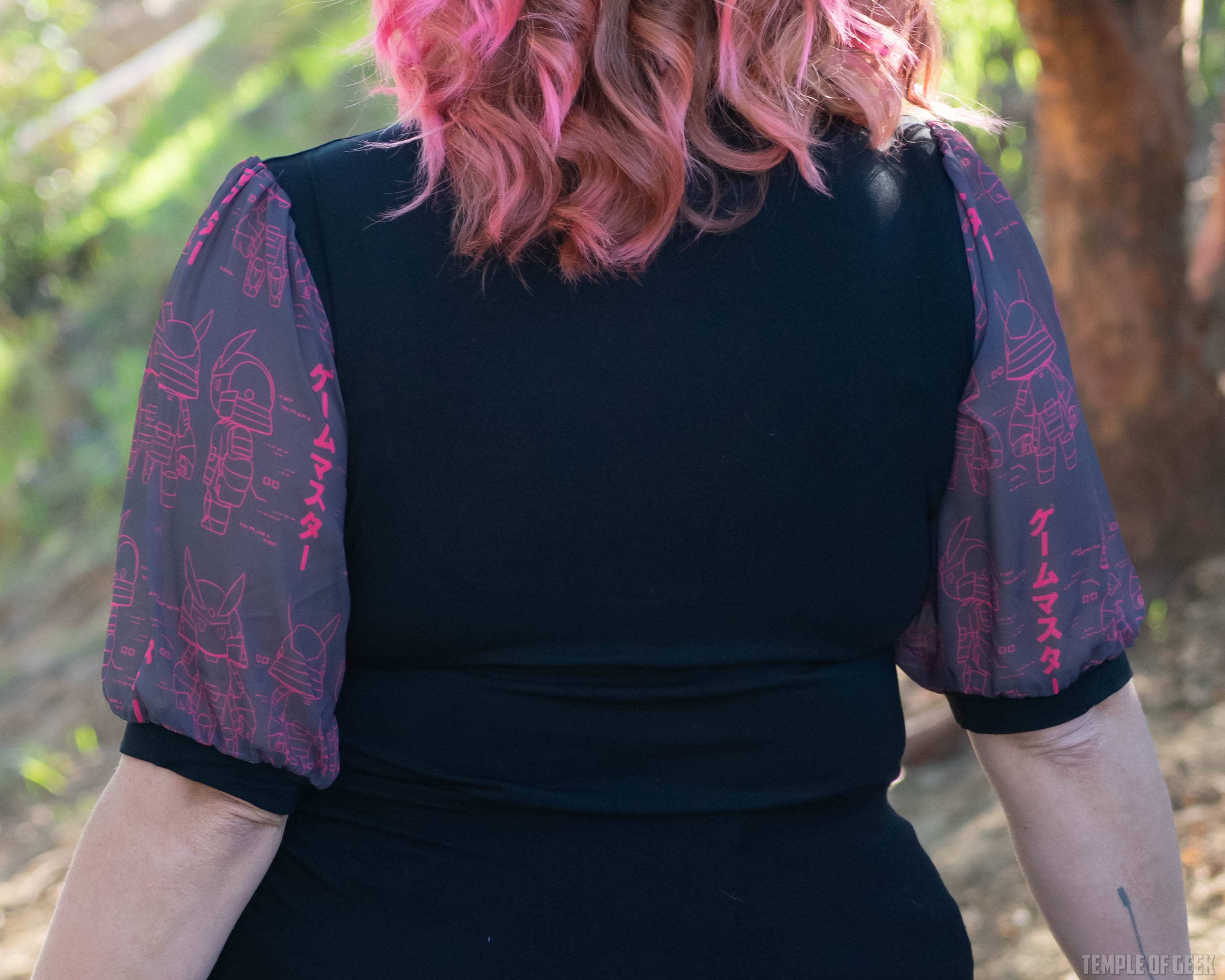 The cool fabric and soft, silky feel of this elegant but geeky top does have an extra comfy feel. With a print emblazoned with mascot Hawk and Kanji characters, those sheer, dreamy puff sleeves really make the look.