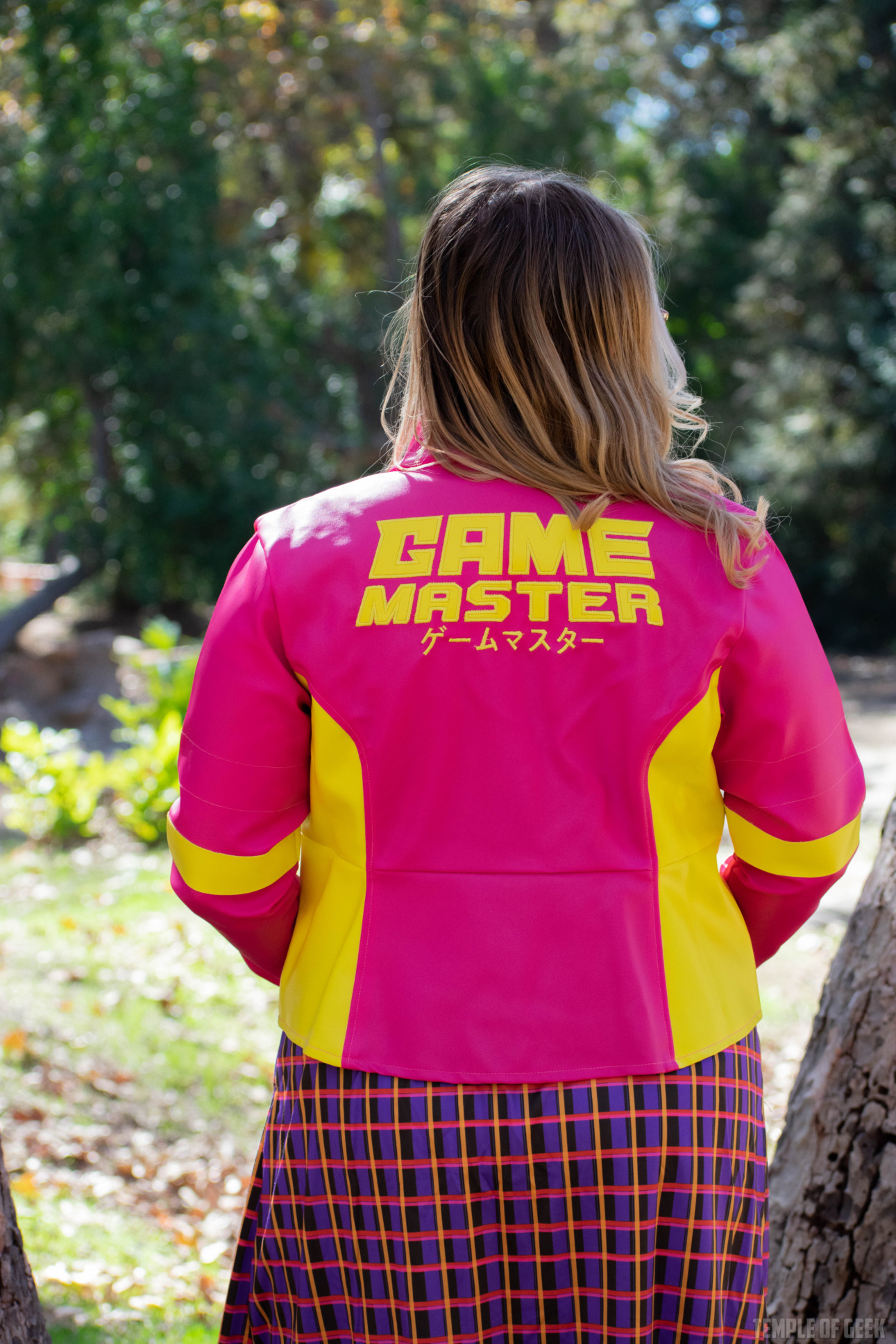 There are a lot of great ideas here. The combination of vivid pink and yellow is dazzling. The armor-like style juxtaposed with the more feminine princess cut and peplum style add flair to the look. We love the way the GameMaster logo is splashed prominently across the back. This is such a cool-looking jacket, a real statement piece made of high-quality materials.