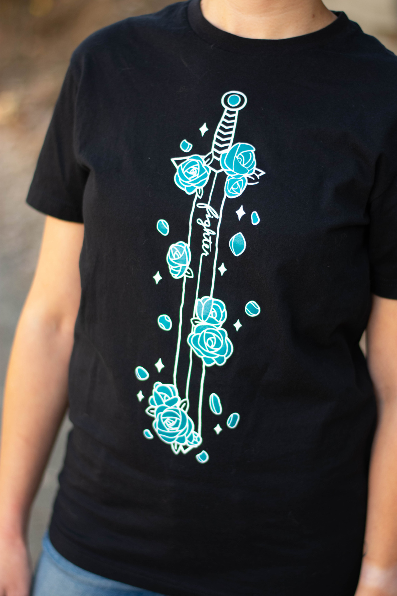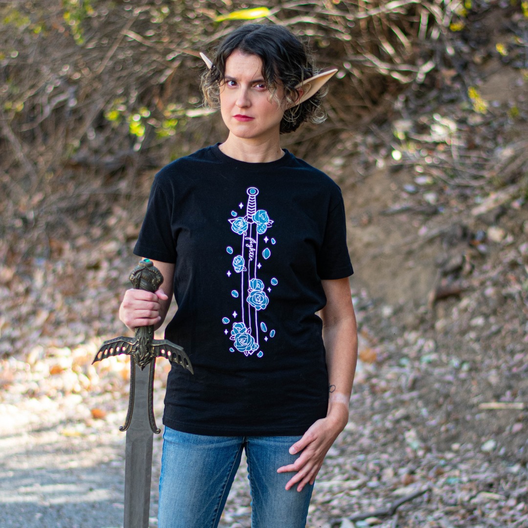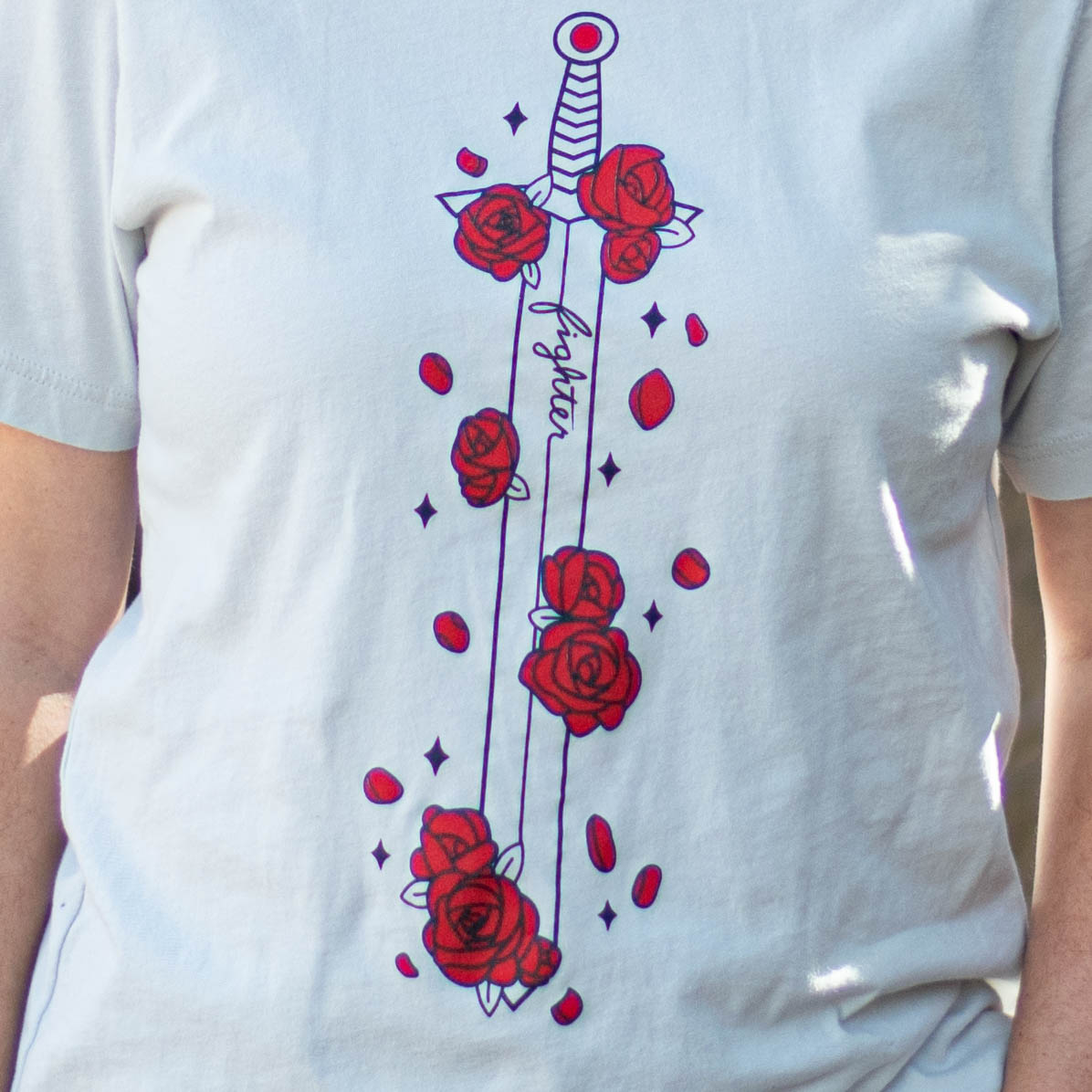 Delicate roses wind around the blade of a sword in a gorgeous, screen-printed design you’ll be itching to wear to your next D&D night. The word “fighter” is gracefully etched along the blade. The design perfectly embodies Guild Party’s signature contrast of hardness and softness.