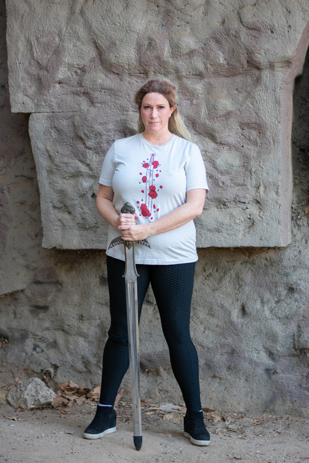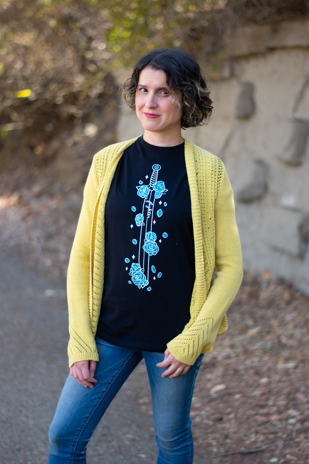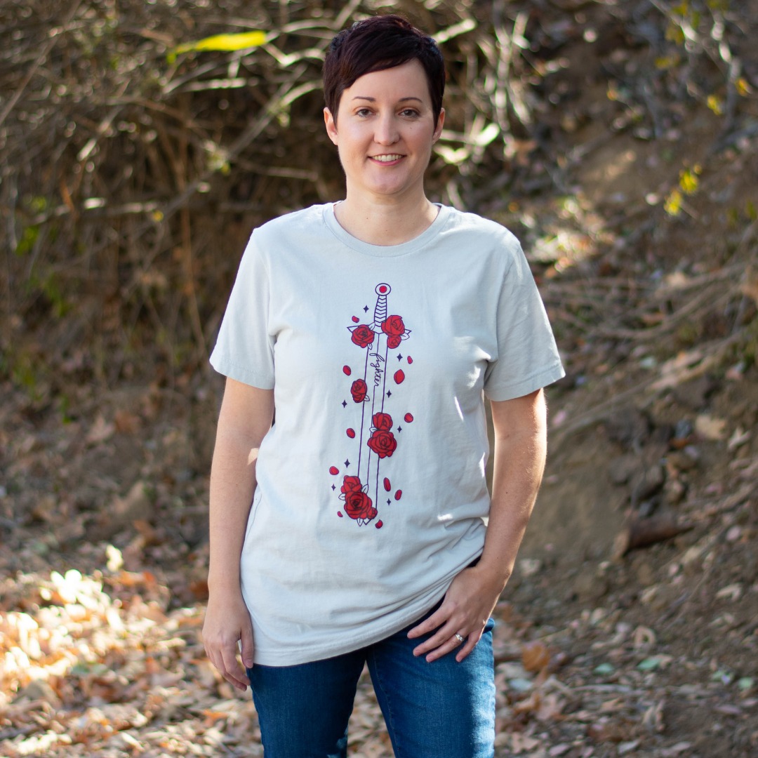 Delicate roses wind around the blade of a sword in a gorgeous, screen-printed design you’ll be itching to wear to your next D&D night. The word “fighter” is gracefully etched along the blade. The design perfectly embodies Guild Party’s signature contrast of hardness and softness.