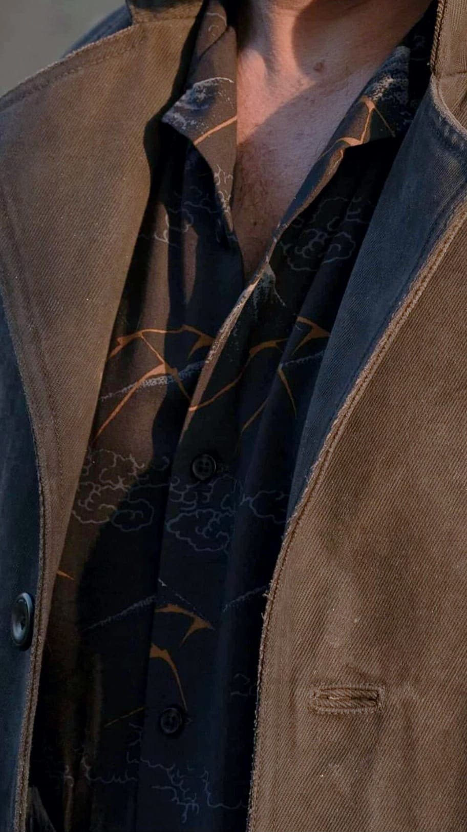 Promotional images for the show like the one below gave us a clear look at the shirt and what the design is. We found that it is the Uniqlo Men’s Blue Short Sleeved Collared Button Down Crane print shirt. The shirt is made by Uniqlo Co., Ltd,  a Japanese casual wear designer, manufacturer, and retailer. You can find some sizes available on the Uniqlo site here. Urban wears this shirt in Season two, Episode six “The Bloody Doors Off” as well as in promotional photos for season two.