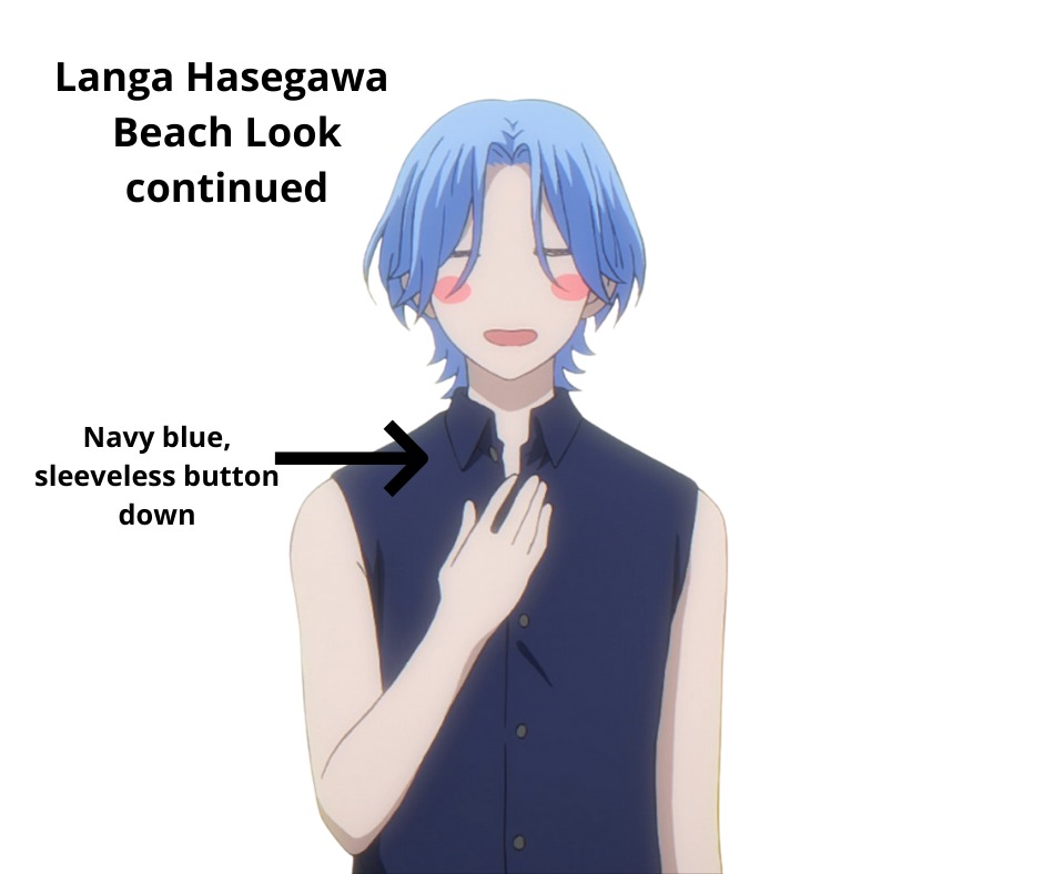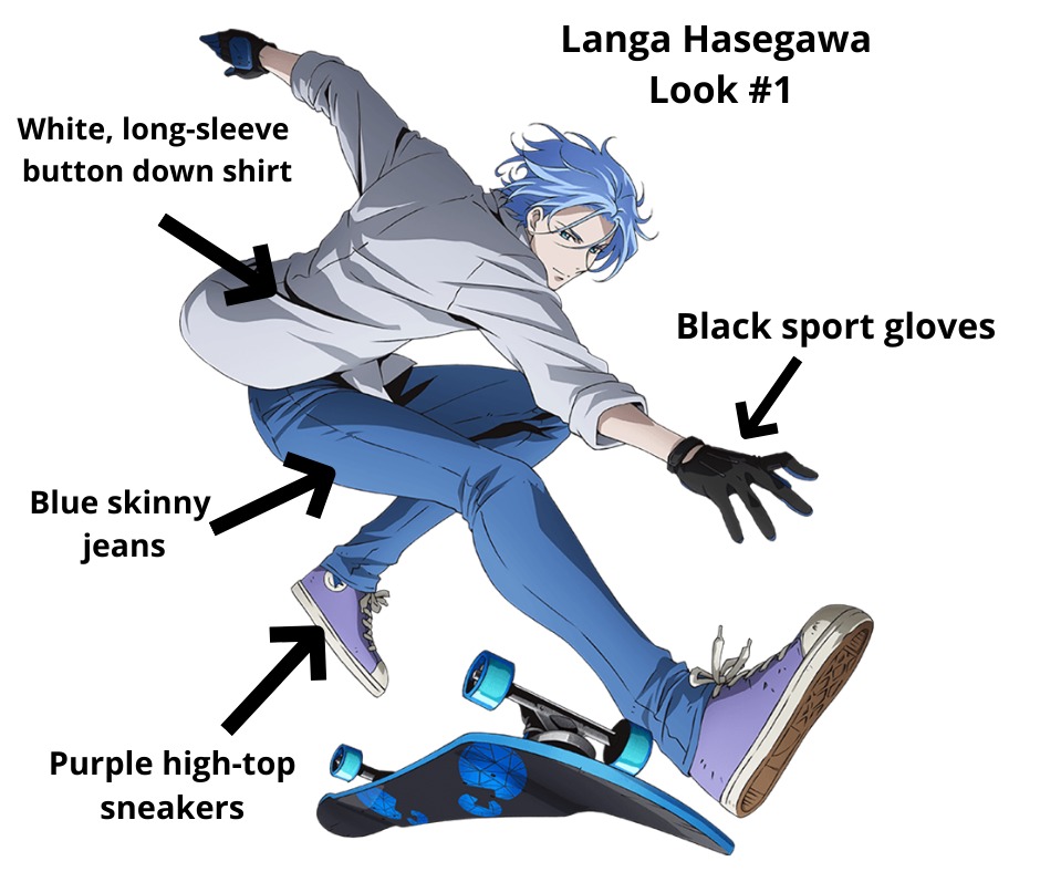 As with most anime or animated shows, the characters tend to stick with the same basic outfits. In this case, Langa has a more summer-time outfit in the episode, “Steamy Mystery Skating?!” that still represents his signature button-down and skinny jeans.