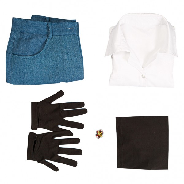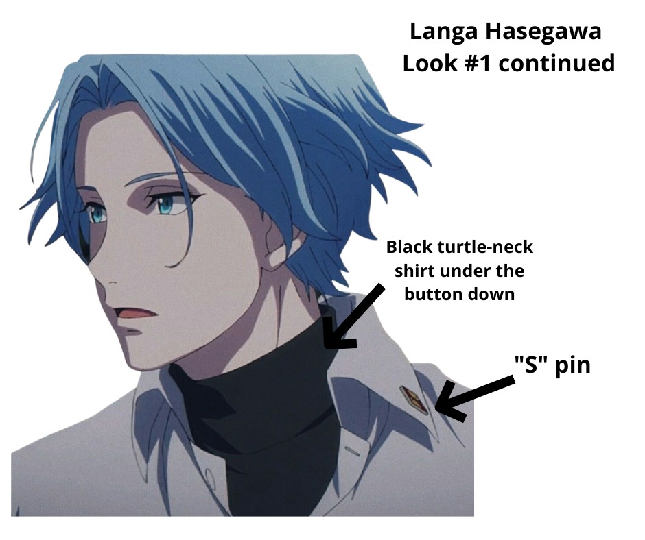 This is Langa’s outfit for a majority of the show. He wears a white, long-sleeve, button down shirt. Under the button down is a black turtle-neck shirt. The turtle-neck is short sleeve, but depending on the weather where you cosplay, a long-sleeve would work as well. Blue skinny jeans and purple high-top sneakers complete this outfit. The black gloves are only worn by Langa in skateboarding scenes, so they do not make or break this cosplay. On the left side of the button down collar is an “S” pin.