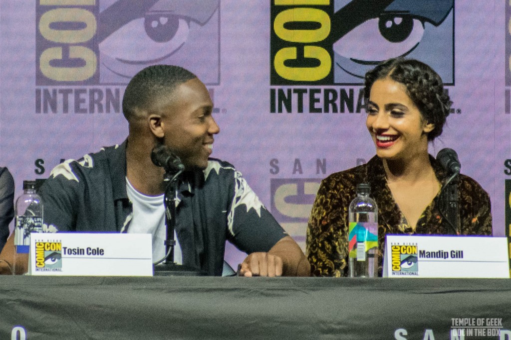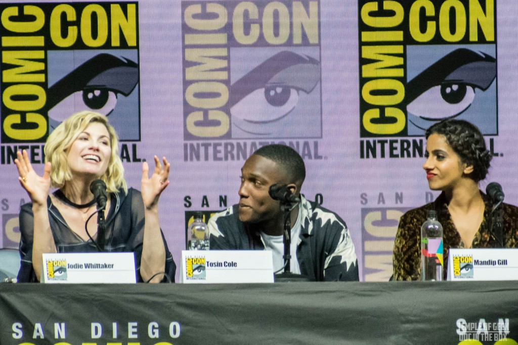 The panel opened with a very cute video clip of Jodie making her way from Cardiff to San Diego. She is an absolute delight. If half of her energy and personality show up in her Doctor, fans will not be disappointed in this regeneration. She couldn’t reveal much about the upcoming series (Spoilers, sweetie), but the little she did say makes the wait until the show starts back up seem that much longer. Tosin is a bit of a goof who deferred to Jodie quite a bit and Mandip is a wonderfully strong woman in her own right. We did not get to see the dynamic between them and the last companion, Graham (played by Bradley Walsh). He did send in a very funny video, which is not surprising given what we know about Bradley’s personality.