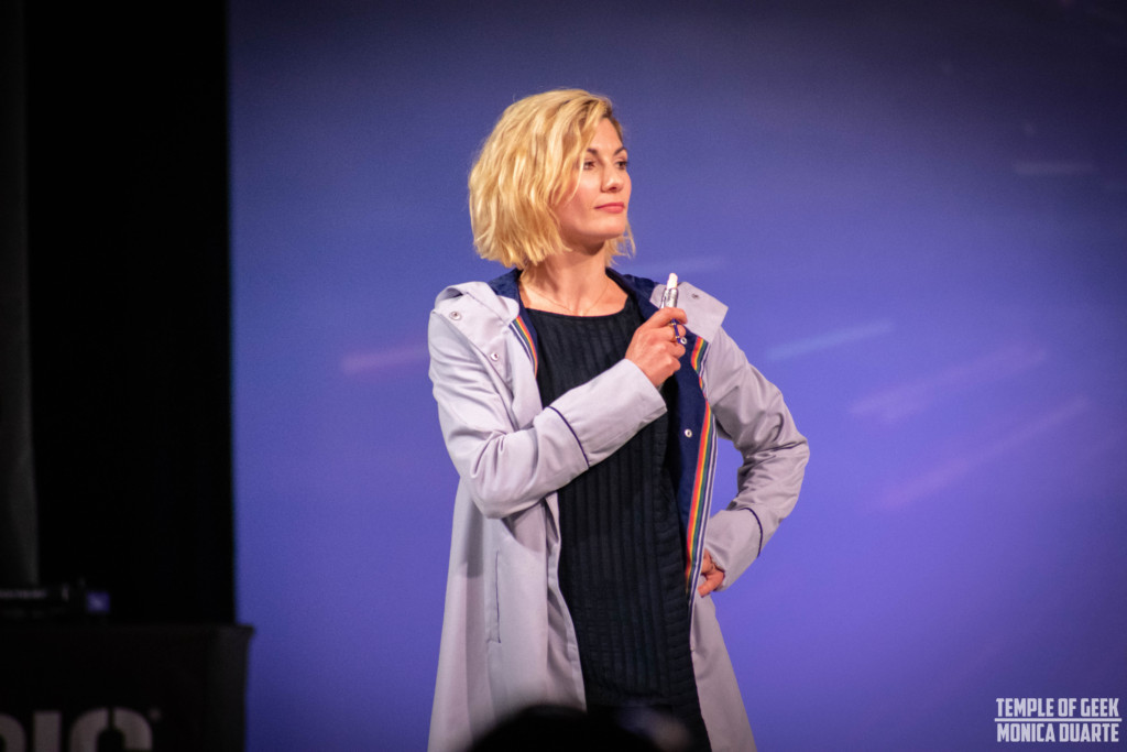 On July 19th the Her Universe Fashion Show 2018 celebrated its 5th year at San Diego Comic Con. The Fashion Show which brings the glamour and couture aesthetics of New York Fashion Week to San Diego Comic Con had a very special guest grace it’s runaway! Jodie Whittaker was recently cast as the new Doctor in the British Sci-fi series, Doctor Who. Whittaker made her Comic Con and Hall H debut on Thursday and that evening surprised attendees at the Her Universe Fashion Show by walking the runway as a model in the new Her Universe 13th Doctor Coat! The coat is on sale during the convention at the Her Universe Booth and will be available at Hot Topic Stores in the fall. Host, actress, author of “It’s Your Universe” and Her Universe Founder, Ashley Eckstein welcomed Whittaker to the stage in true fan girl style! The first female Time Lord hit the runway with her face hidden from the crowd and as she removed her hood the crowd exploded into cheers! She even had a sonic screwdriver in hand! Watch the video below via SoCalThrills and see exciting moment when Jodie is revealed as the runway model and listen to her and Ashley talk about what inspired the look and style of the 13th Doctor.