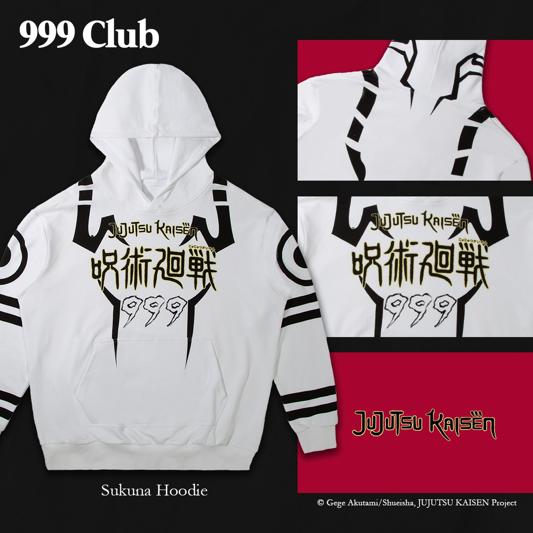 • Sukuna Hoodie – Custom Heavyweight Cut & Sewn Hoodie in White featuring the iconic markings of Ryomen Sukuna. Available soon – keep an eye on 999 Club social channels for more.