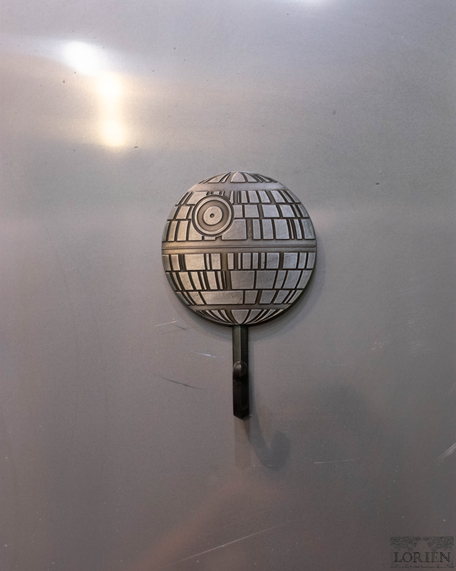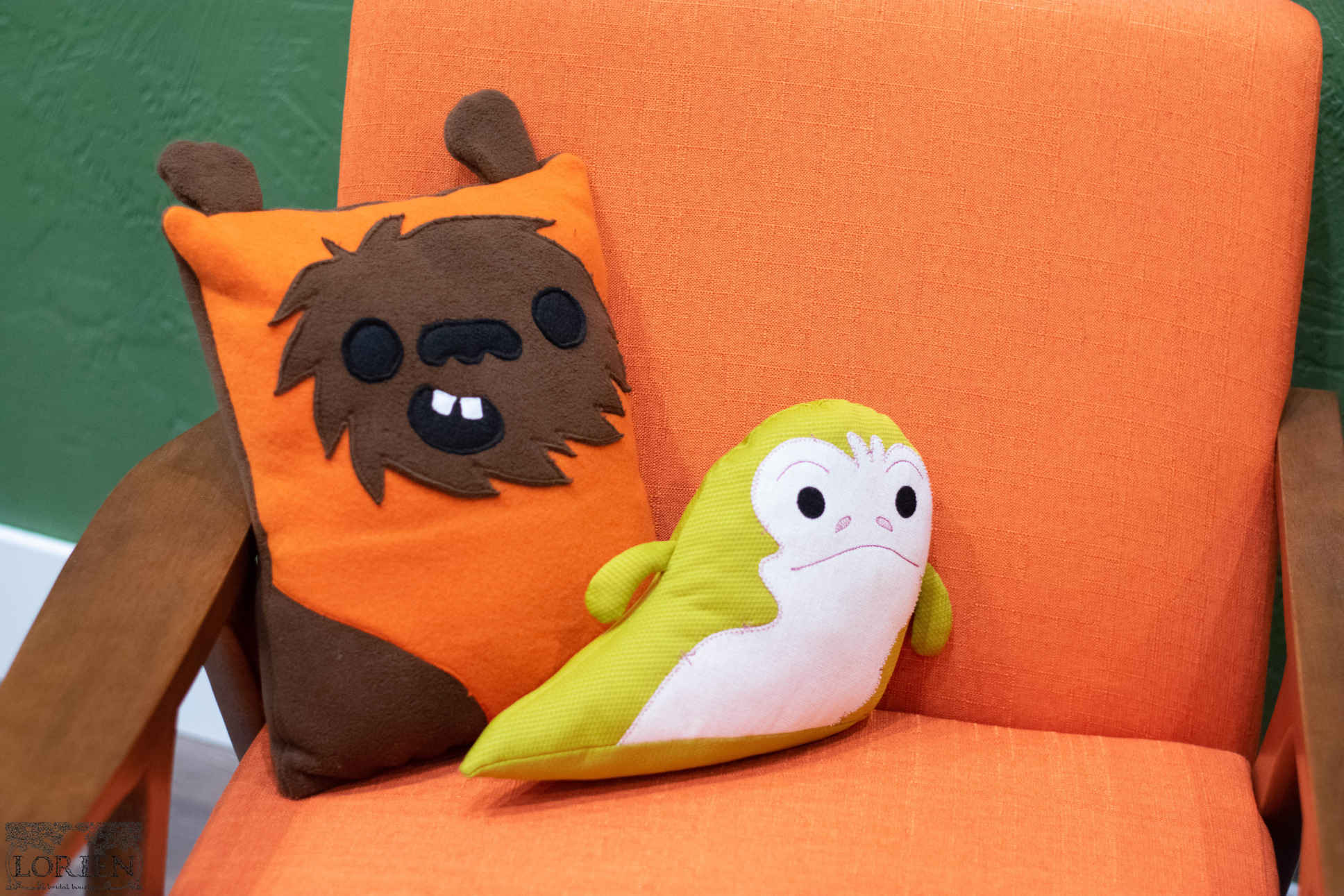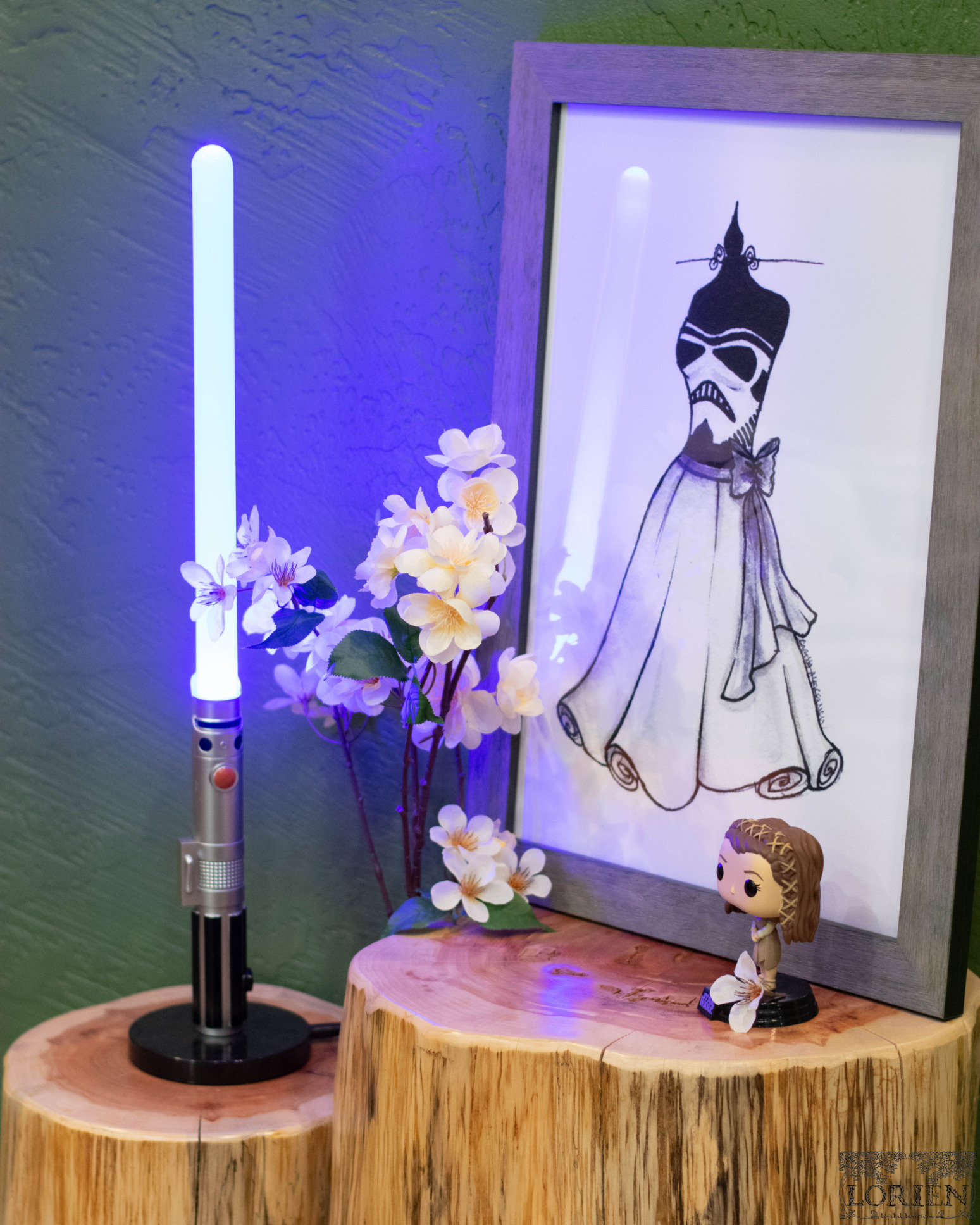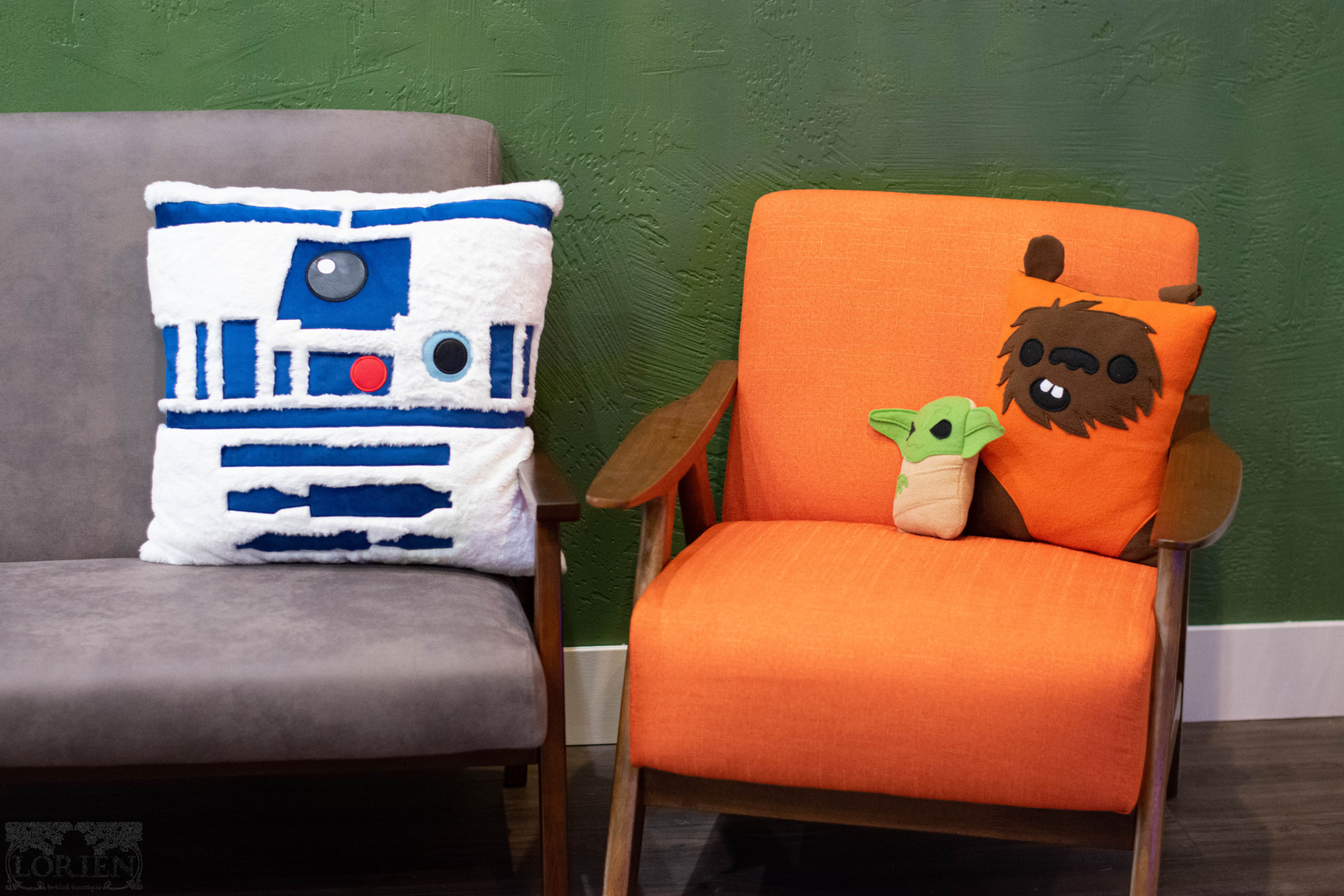 The Force is Strong with this bridal boutique. In what is arguably the most obviously geek corner of the store, Lorien Bridal welcomes you to an Endor inspired dressing area. We can not get over the lightsaber inspired hanging lights and the adorable pillows. I can’t imagine what more a geeky bride could want. Will you choose a dress from the dark or light side?
