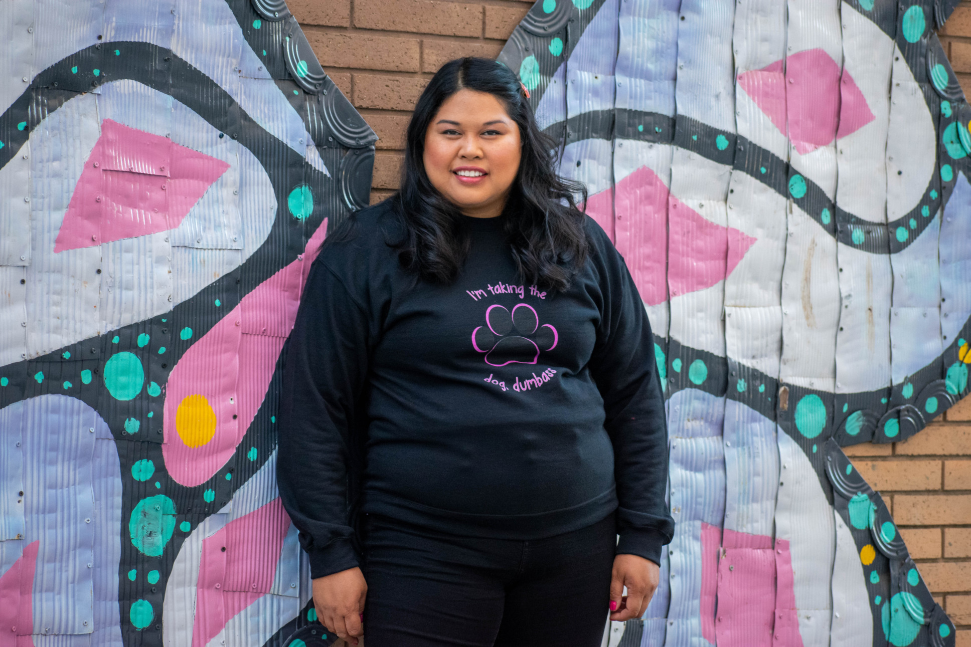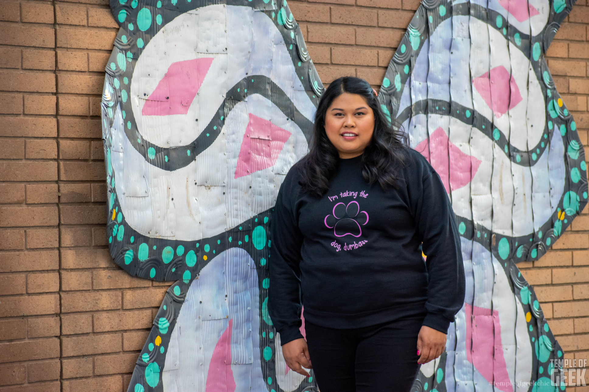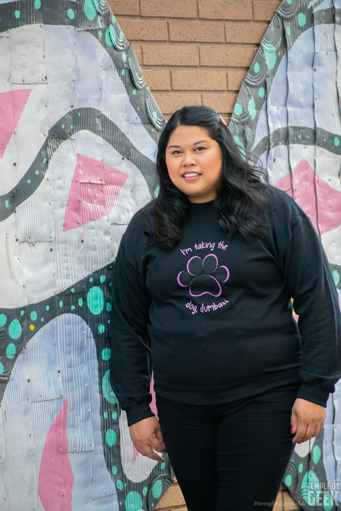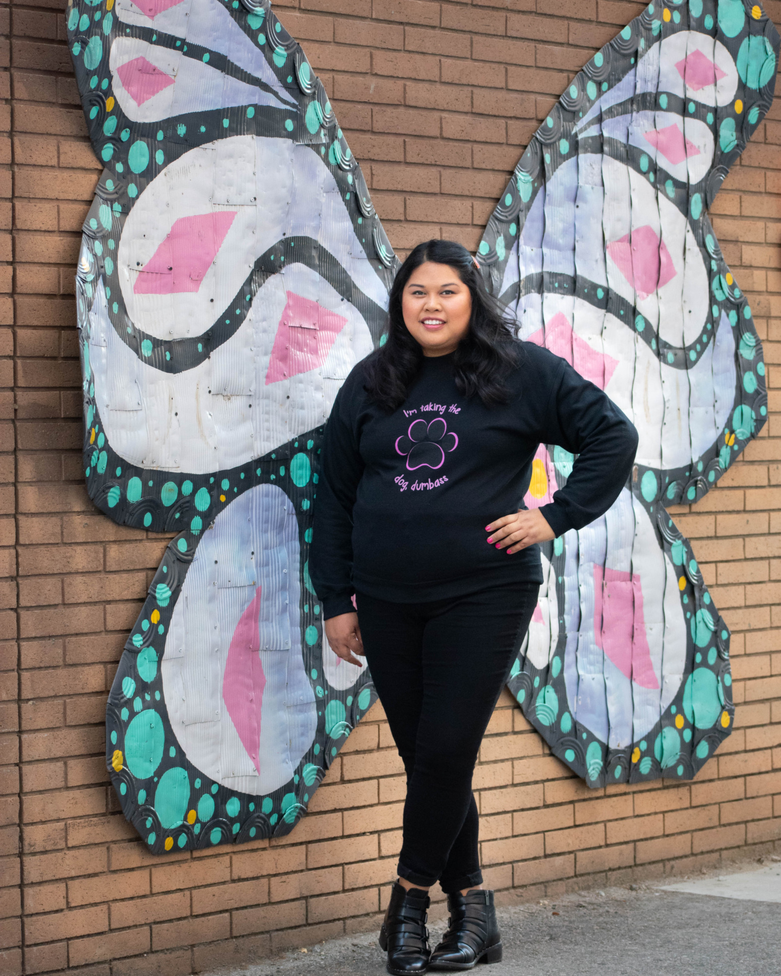 Inspired by Paulette’s big moment of standing up for herself, the Taking the Dog sweatshirt is super comfy. It’s warm and cozy. It’s made with 52% airlume combed and ring-spun cotton and 48% poly fleece. Model Stephanie paired it with a pair of black ankle jeans and black booties.