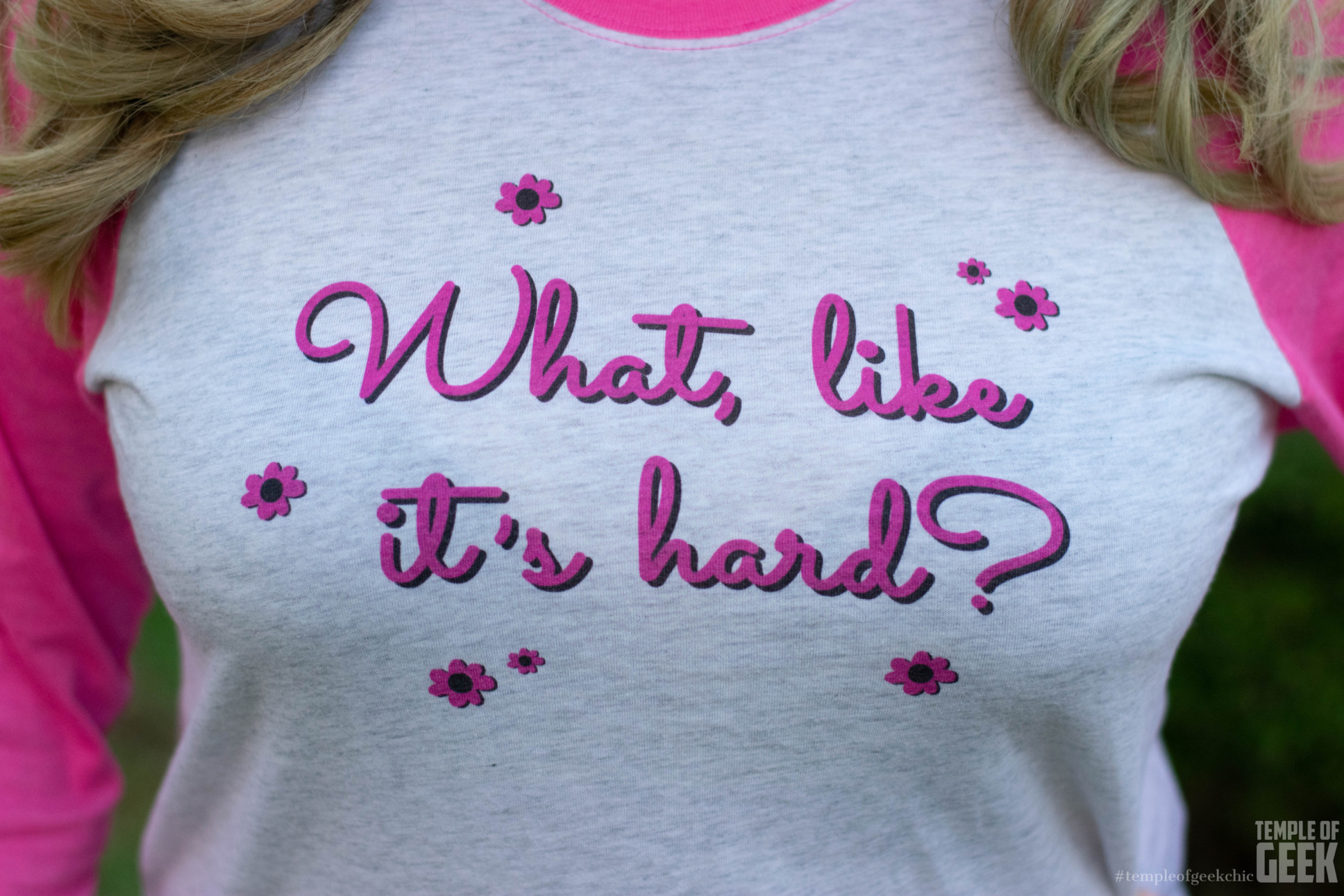 Inspired by one of the most popular lines in the film franchise. This lightweight tee is very girlie and comfortable. It is a very thin shirt, and very soft, would make a very comfy pajama top. The What Like It’s Hard Raglan is available in a Heathe White with Vintage Pink Sleeves. Make sure you check the sizing chart before ordering.