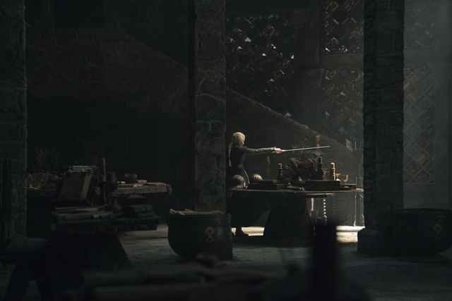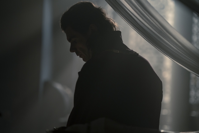 Meanwhile, Prince Daemon is still lost in his dreams in Harrenhall. This time, accompanied by the visions of his late brother and King Viserys I Targaryen (Paddy Considine) and the memories of his banishment from King’s Landing after the Daemon called his infant son Baelon the “heir for a day.” In this vision, Daemon pleads to escape the throne room. When his vision ends, he finds himself back in Harrenhall, with Ser Simon Strong (Simon Russell Beale). Daemon accuses him of conspiring against him and hastily attempts to leave.