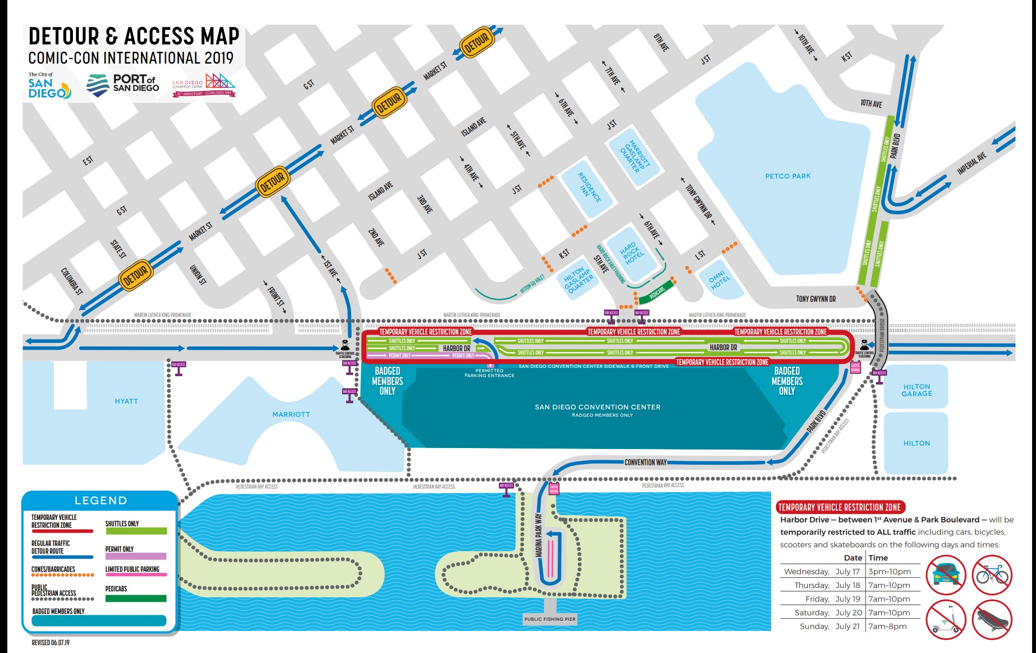Maps – The San Diego Convention Center website has maps with all the important information about the temporary restrictions, pedestrian and vehicle access, and detours during Comic-Con. Knowing what roads are open and closed is essential to getting you to the convention center on time.
