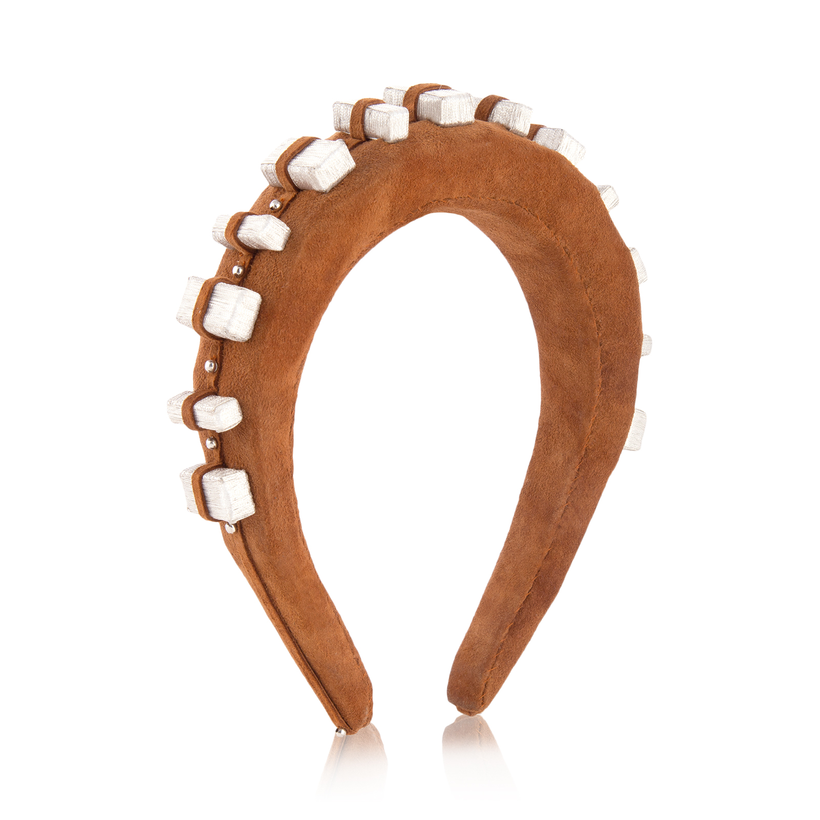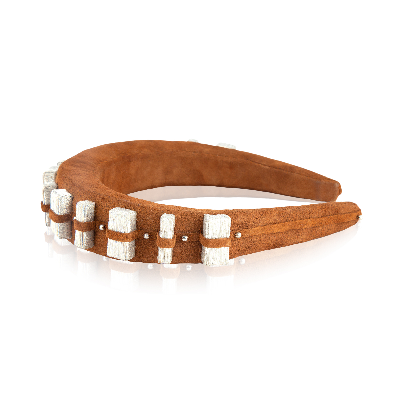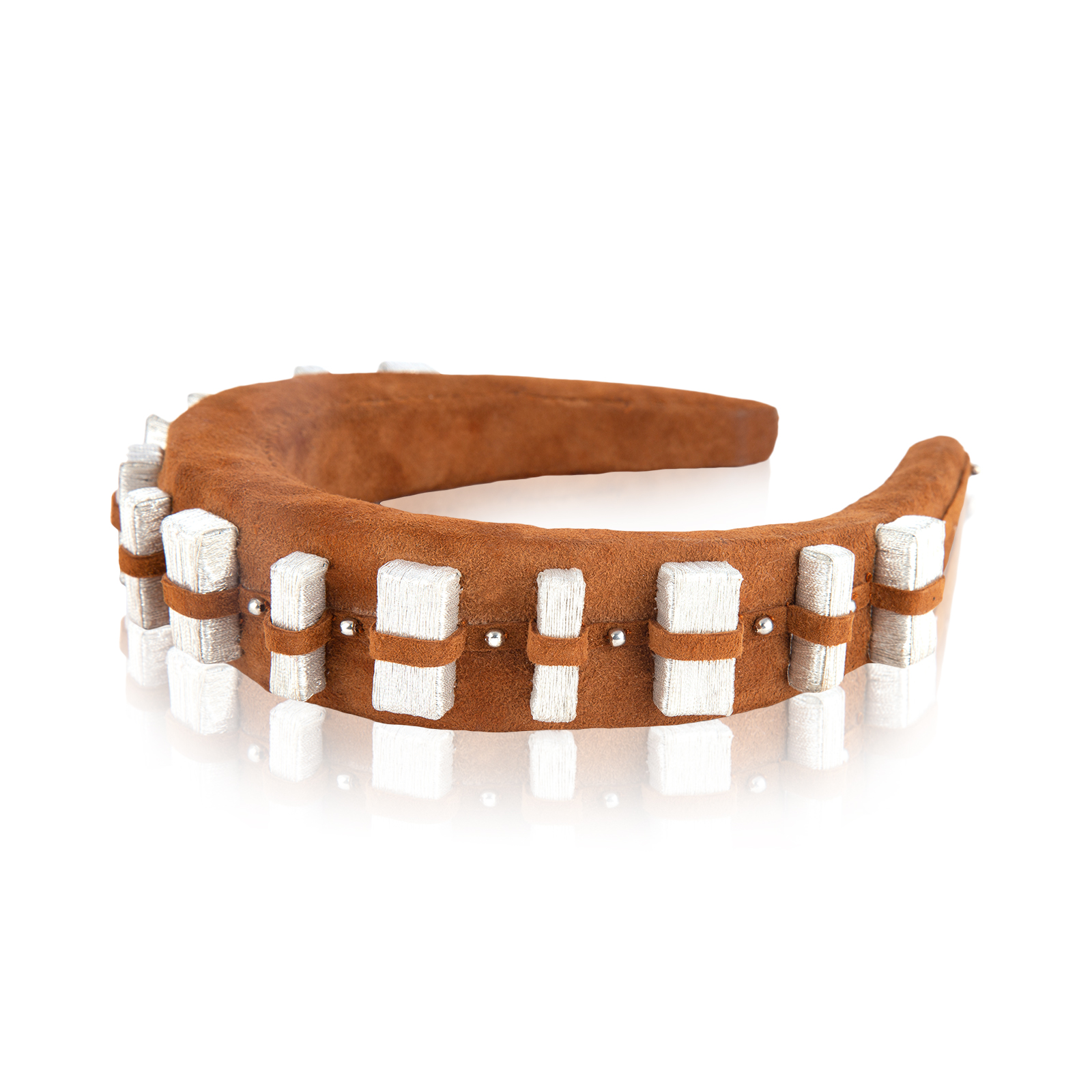 This textural headband is crafted from a shade of warm brown suede leather. Each piece is embellished with intricate silver detailing that is hand wrapped with metallic thread filaments for a reimagined take on Chewbacca’s™ iconic bandolier. $195.00
