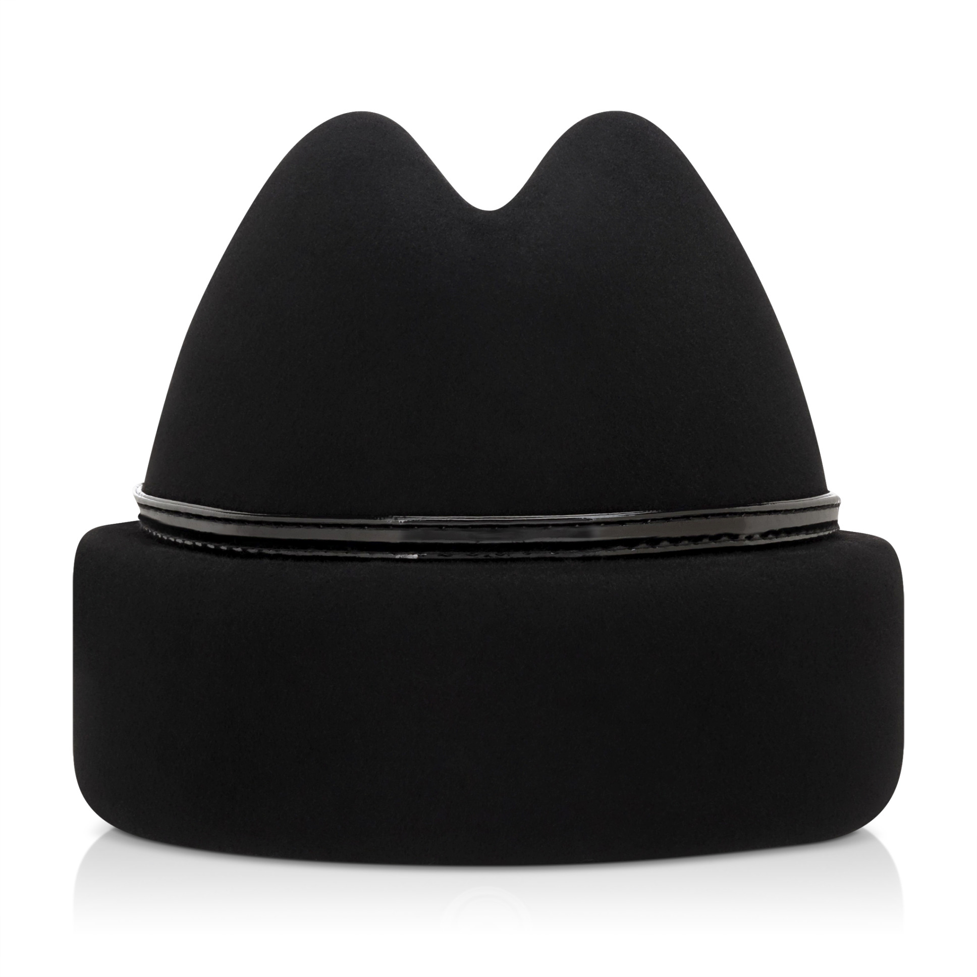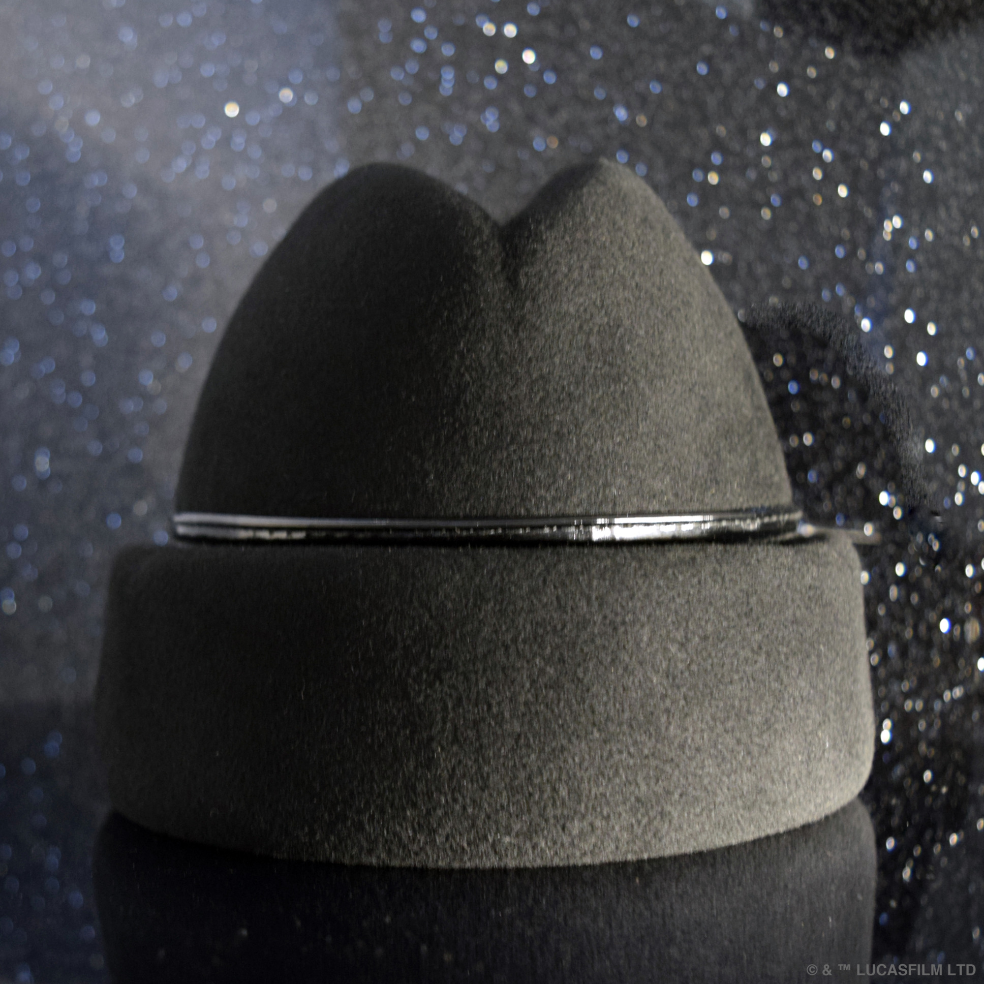 A signature Gigi Burris silhouette reimagined in the spirit of the infamous Darth Vader™. The ‘Darth Vader™ Sharina’ is hand blocked into a pinch crown with a defining cuff. Each piece has the addition of a hand-sewn patent leather trim and black enameled hardware, both of which draw inspiration from his iconic helmet. Textural wool felt is in contrast with the sleekness of the trim and embellishment. A vintage Star Wars logo is printed in repeat on a silk damask interior sweatband. A truly limited edition collectible item that captures the essence of the Star Wars™ franchise, along with the spirit that is Gigi Burris Millinery. $350.00