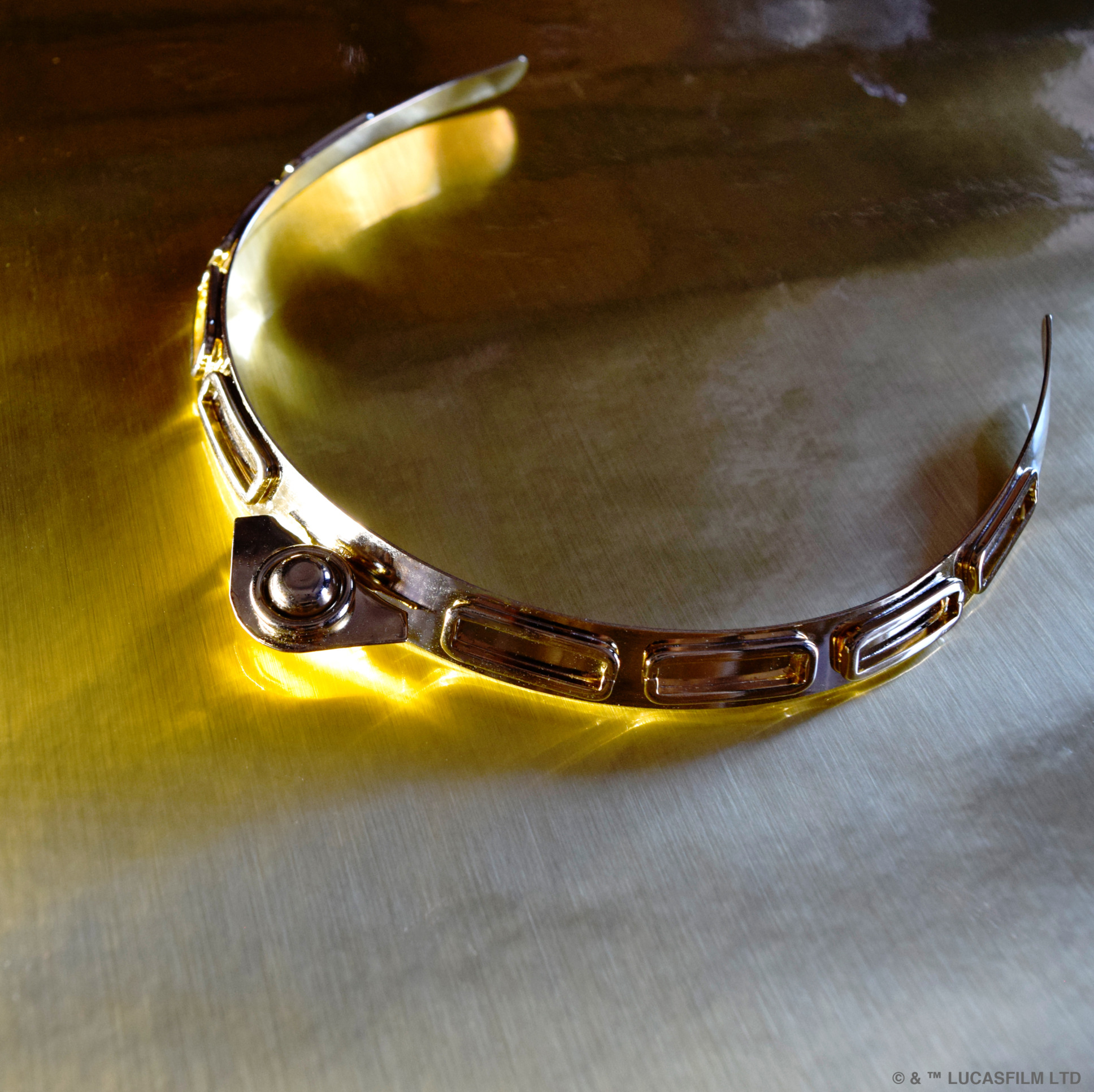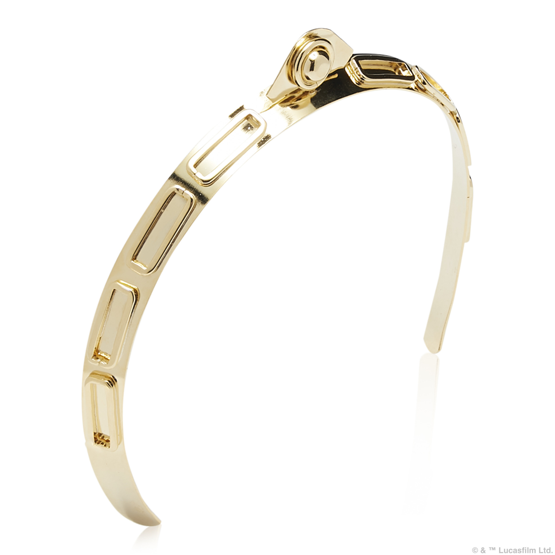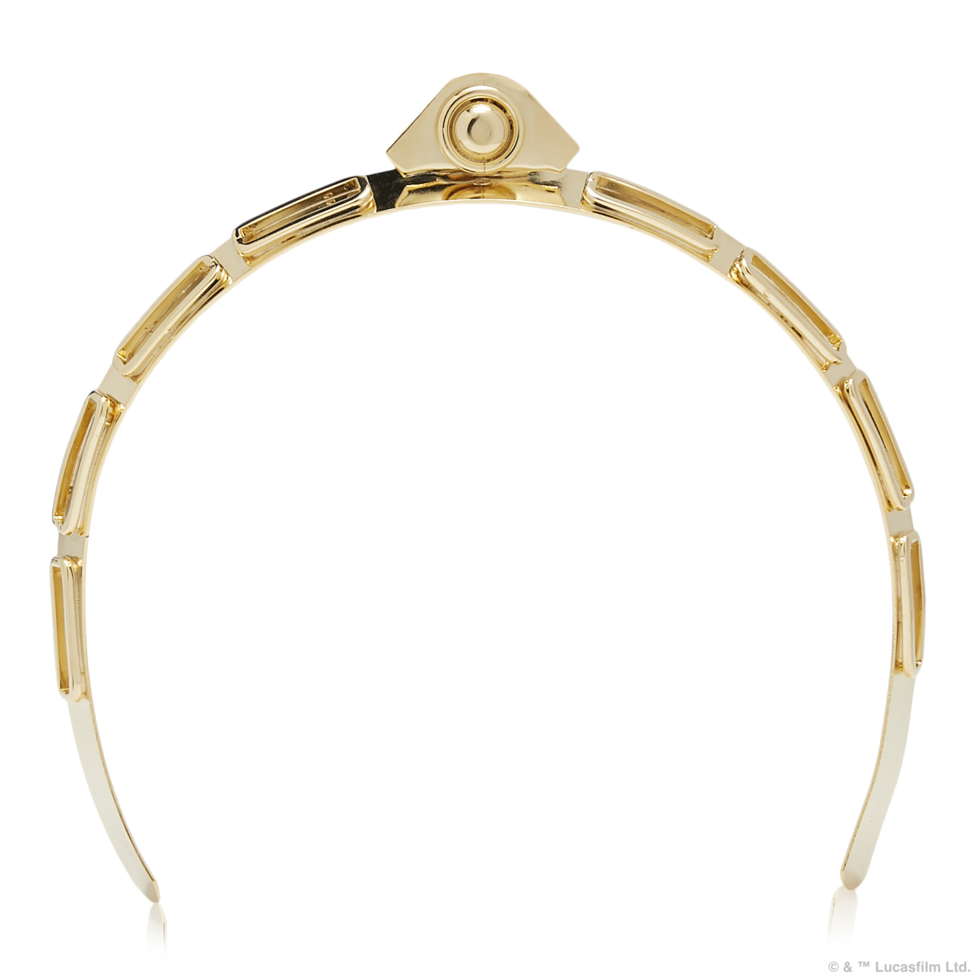 The mechanics of C-3PO™ inspired a tiara-like headband. Handcrafted in NYC, each piece is created using 14 karat gold plated metal. Luxurious, sleek, and modern, the Tiara Threepio™ highlights the molded elements of his robotic features. $195.00