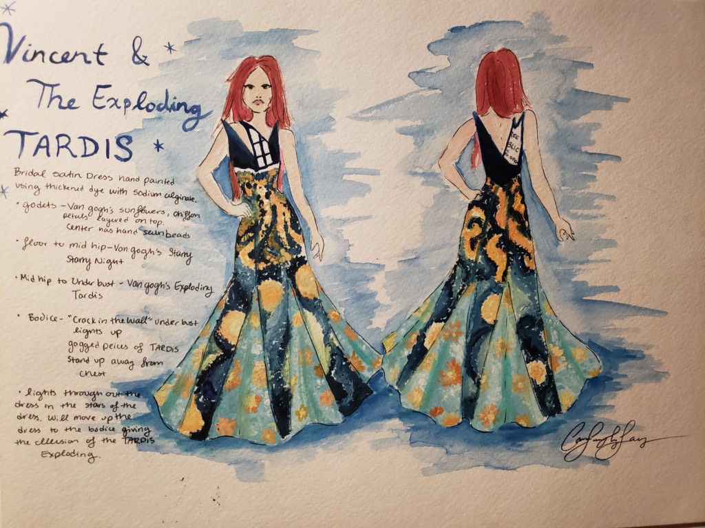 This is my second year participating in the Her Universe Fashion Show. 2016 was my first year being a part of the show with my design inspired by the TV show RWBY that was created by Rooster Teeth on YouTube. I was unable to submit or participate in 2017 because I was a little busy planning my dream wedding, which only made me more excited to participate this year for the 2018 show. The design I created this year, “Vincent and the Exploding TARDIS” Dress, is one that I have been thinking about and designing in my head since the weekend after my first fashion show in 2016!
