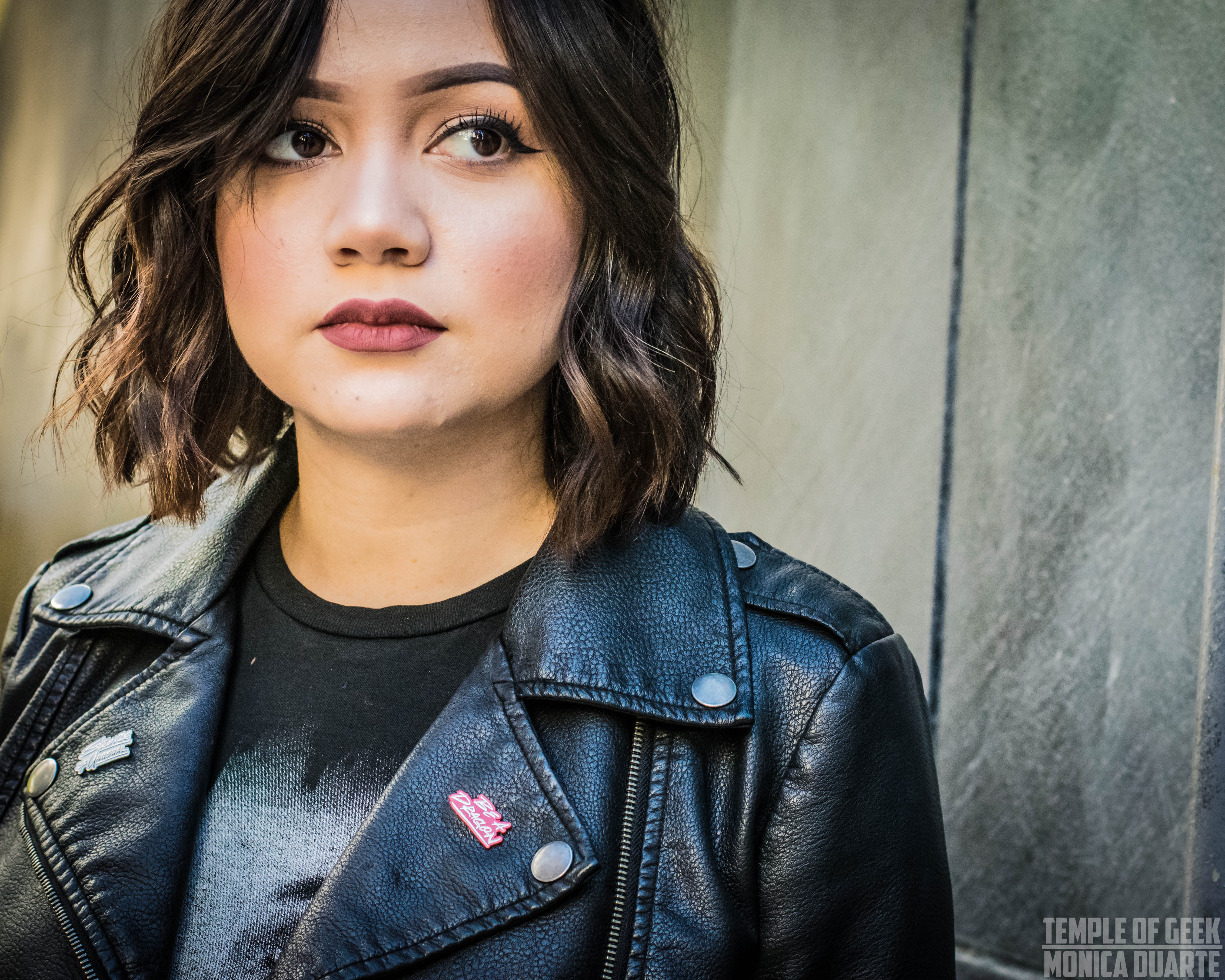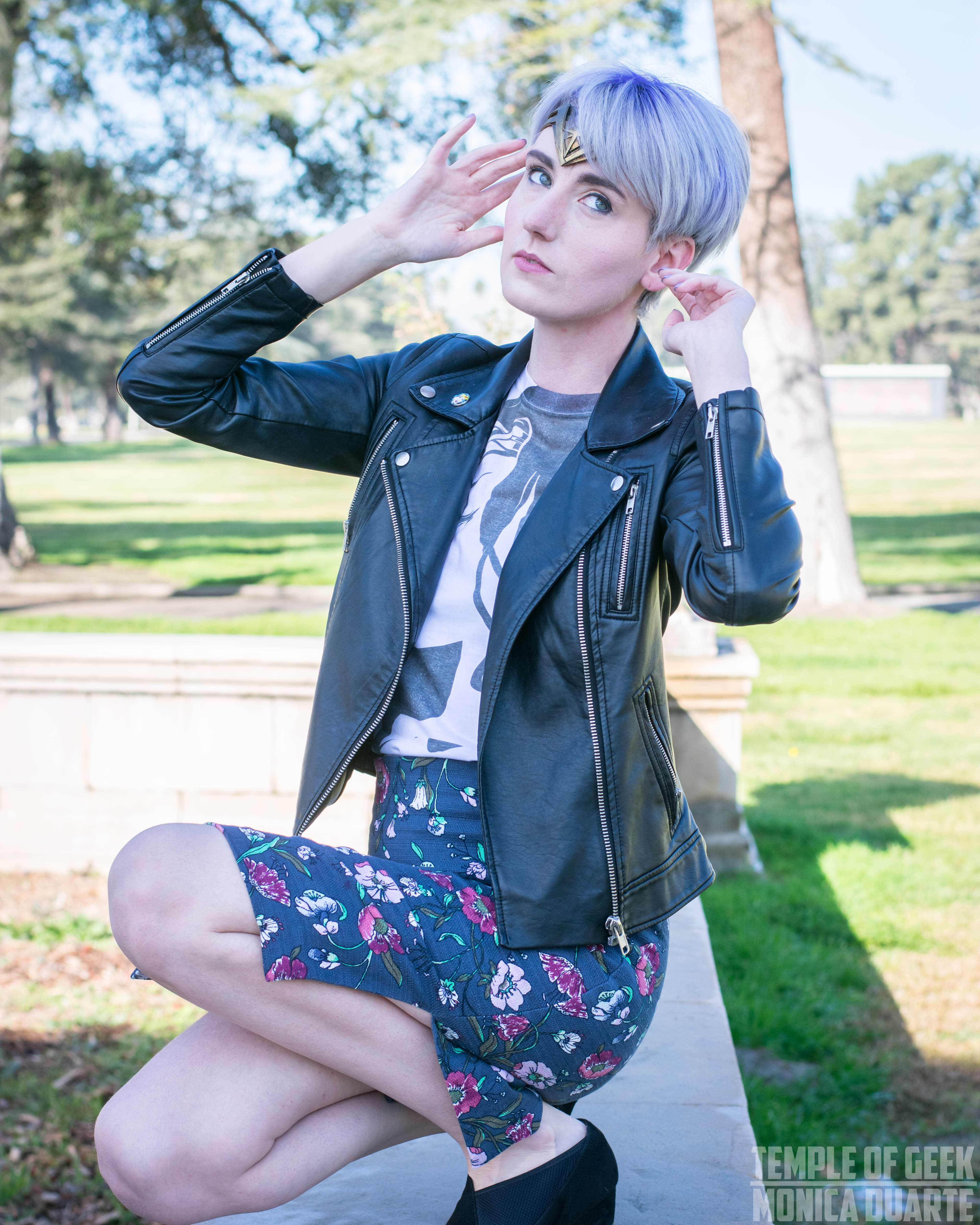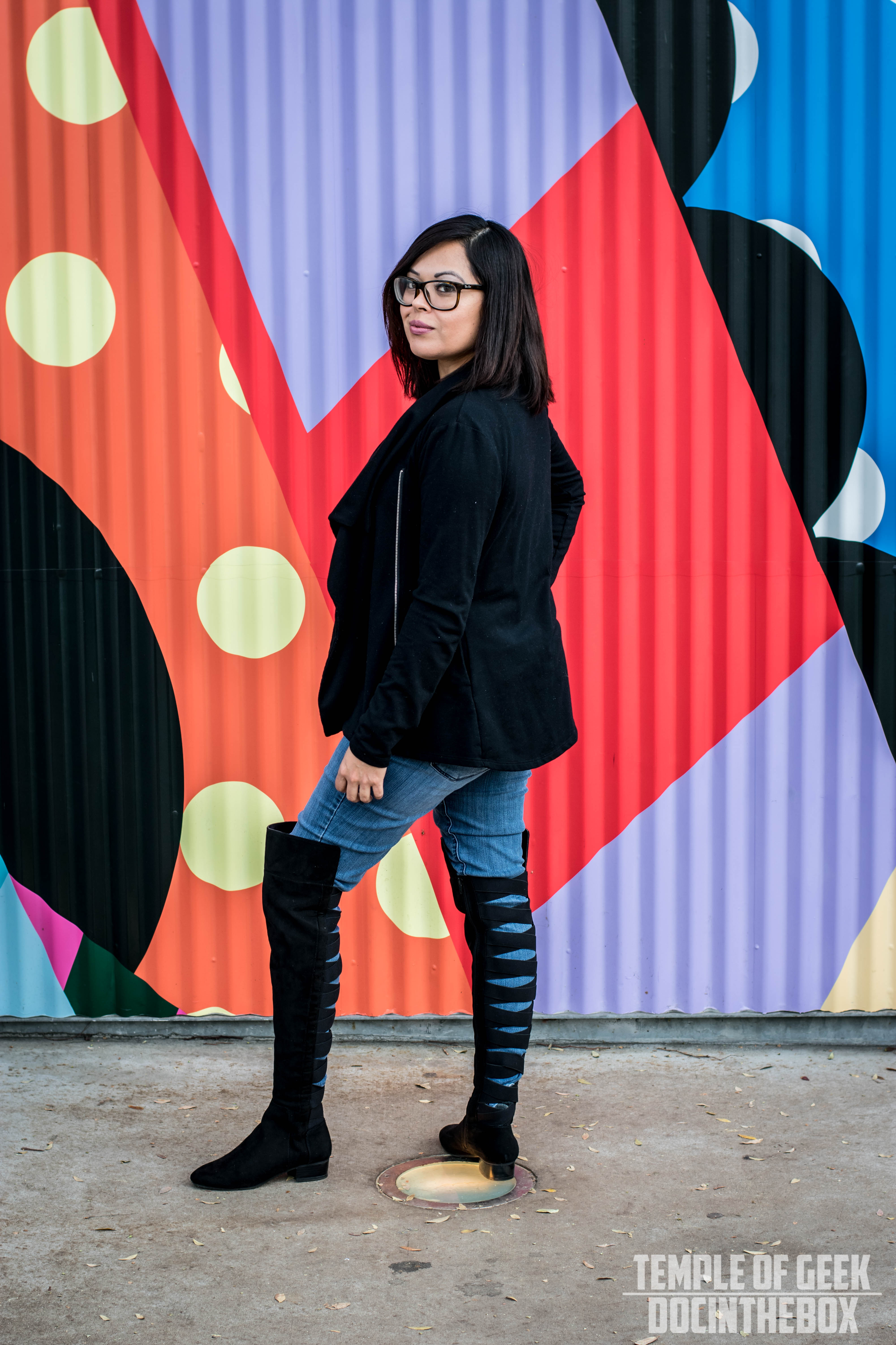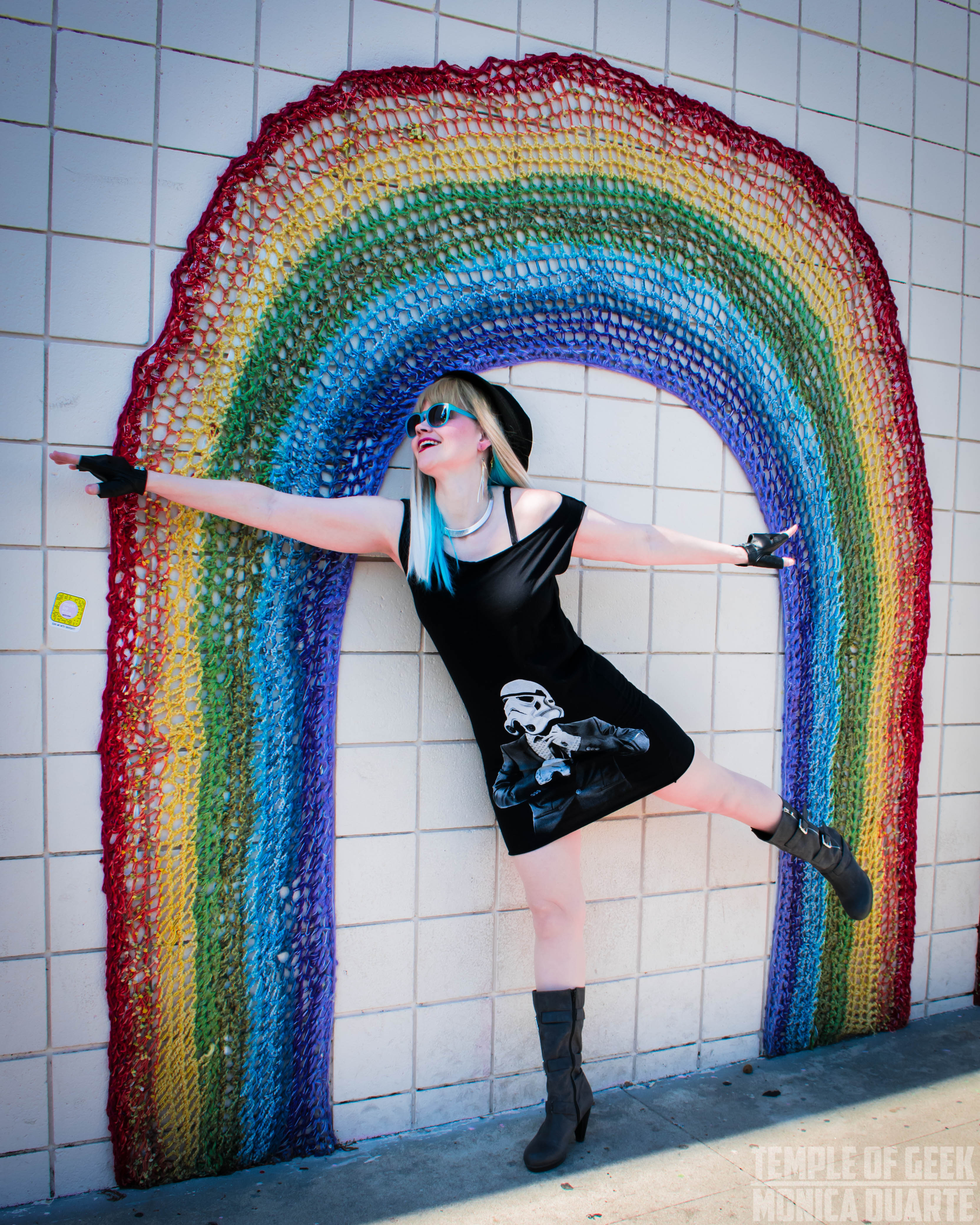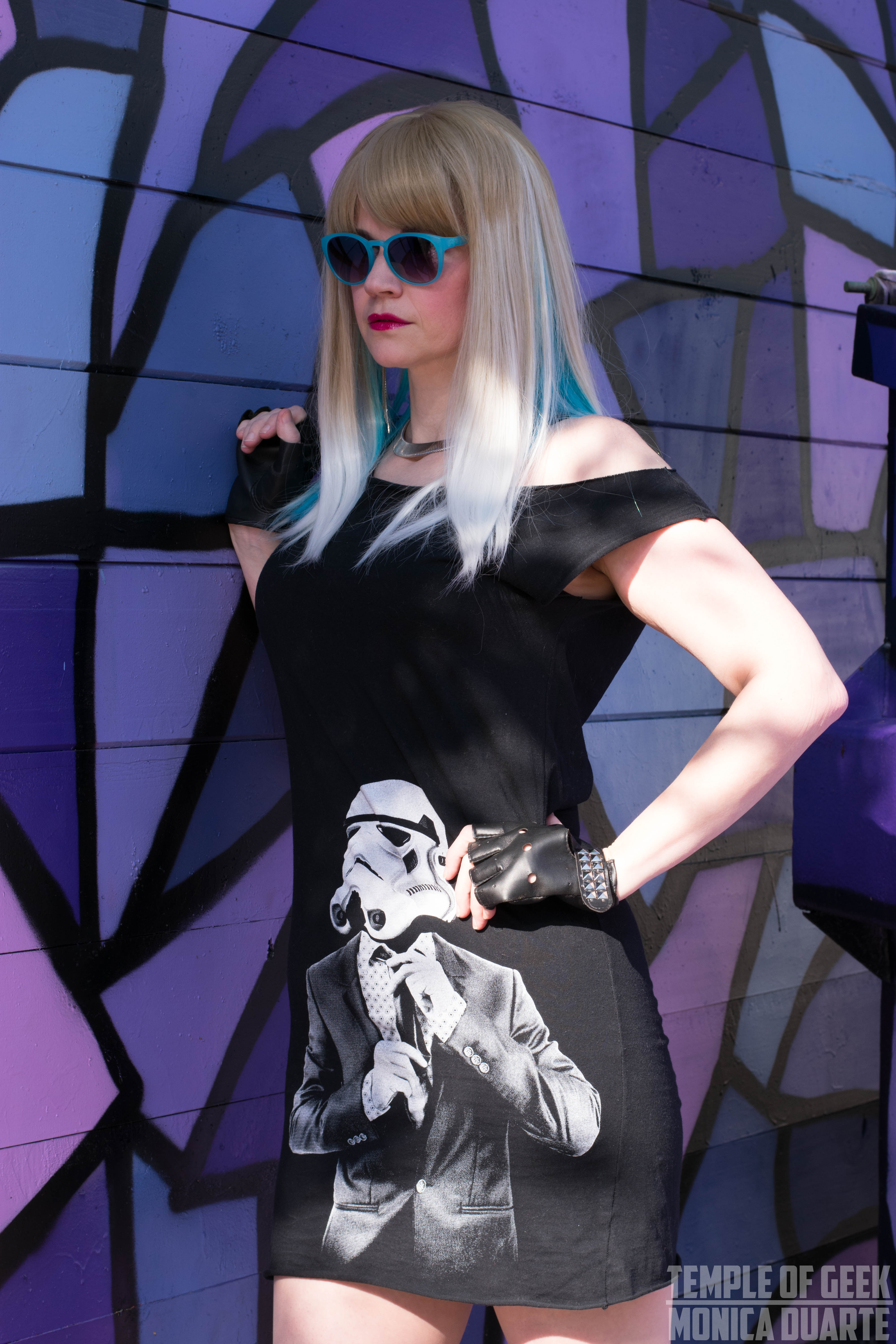 This next look I like to call the Atomic Babe! I think it’s a perfect date night look! Cosplayer, Julie, was inspired to create this look after having watched The Atomic Blonde. The design on this Engram Clothing Star Wars themed dress is pretty epic. As we were taking these photos she was getting compliments from strangers on the dress. Also perfect for that convention floor and definitely a fun way to dress up your geek.