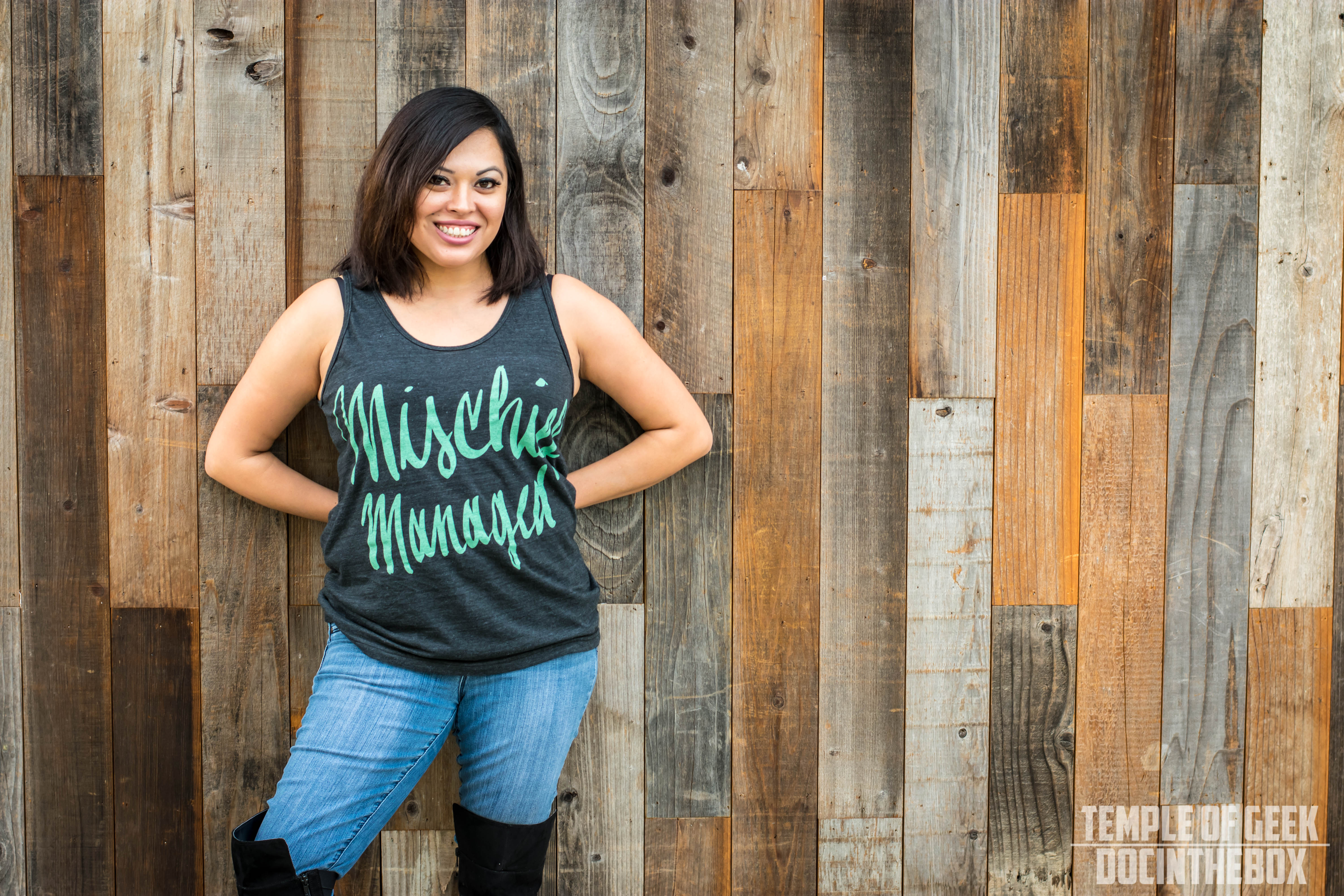 This next look is actually me. I am very casual in my outfits. I like to be comfortable. I am a 37 year old mom of two. I have a lot of running around and chasing after my kids to do. I can’t always be as dressed up as I once was. But I want to feel confident and feel good about the way I look, so I try not to sacrifice style. For me flat boots, jeans, a cotton blend shirt and sweater are my go to. I always feel a need to wear my geek. I love wearing my fandoms. But I like to wear my geek subtly. I like the low key geek feel. I appreciate when you can’t always tell I am wearing my fandoms. This is why I am a huge fan of JORDANDENÉ. This Harry Potter themed tank is one of my favorite purchases! Unless you’re a Harry potter fan, you wouldn’t necessarily know that I’m wearing one of my favorite fandoms.