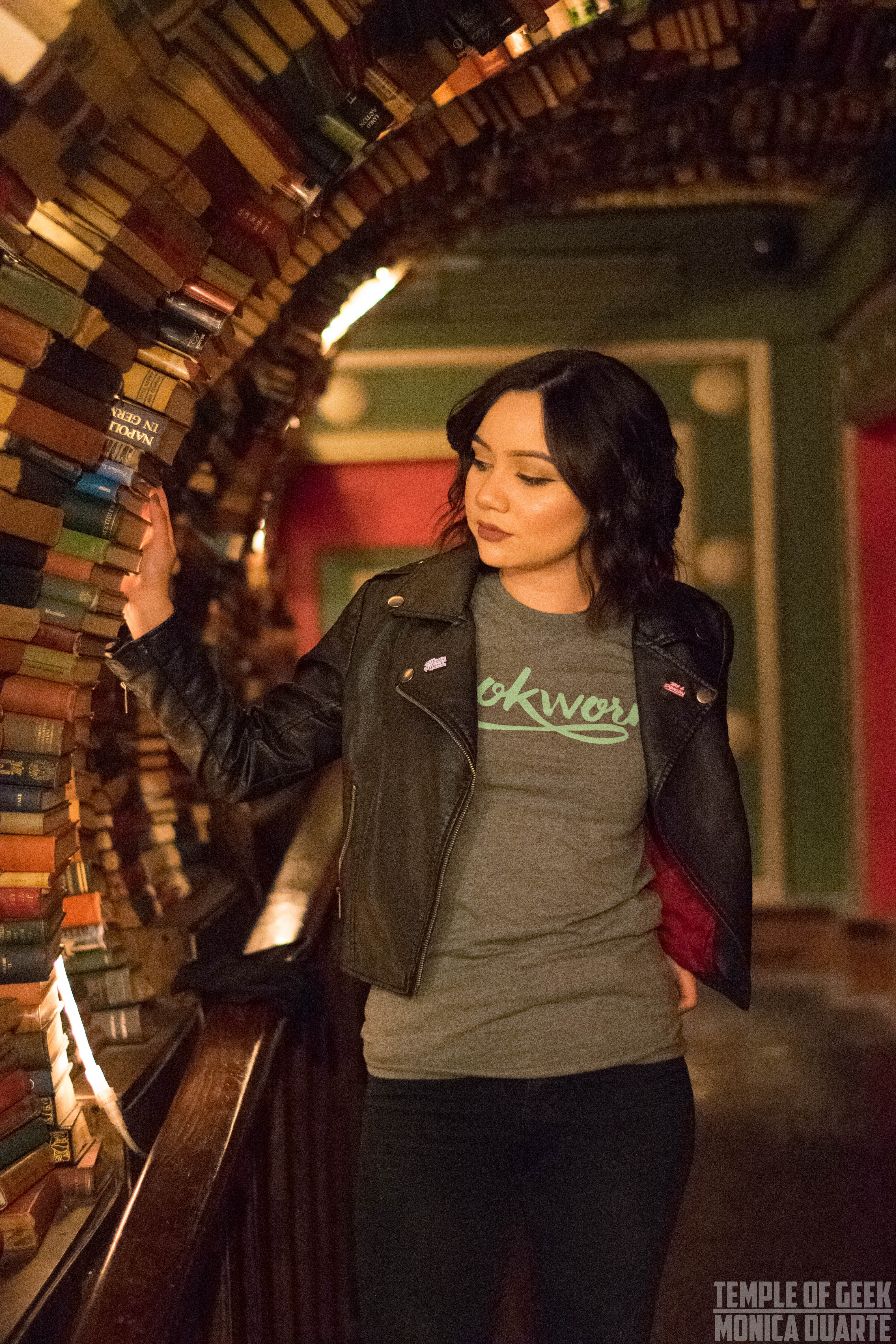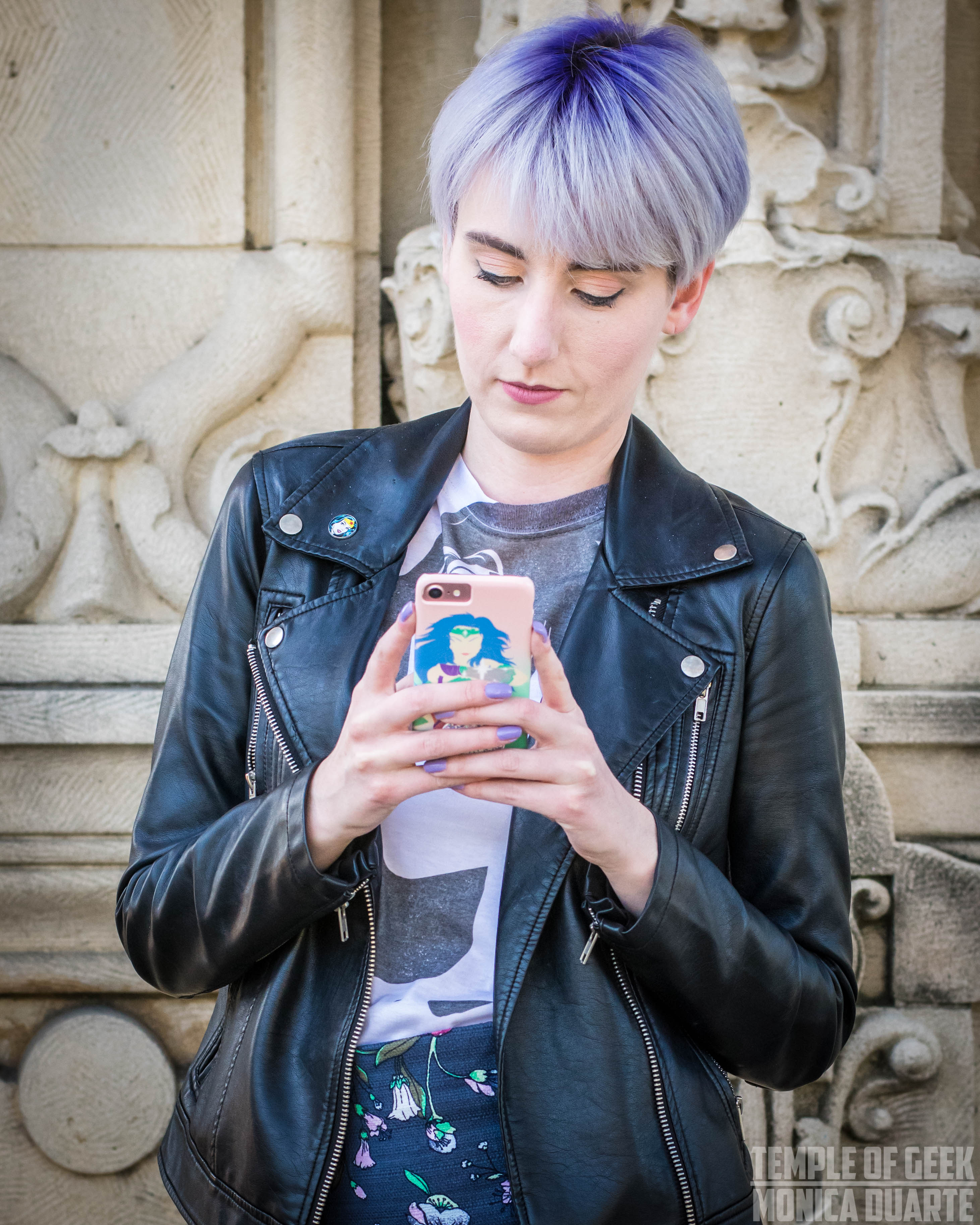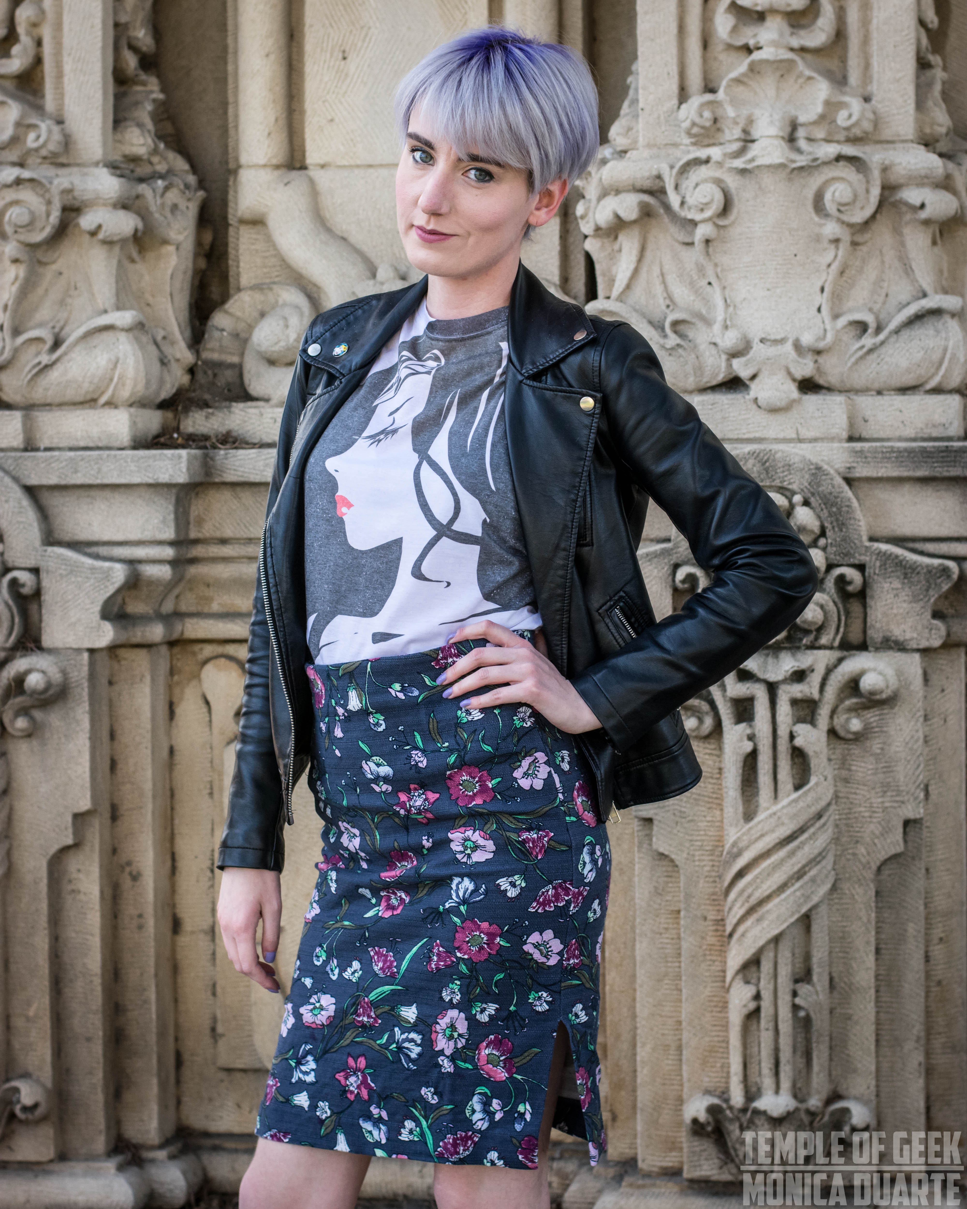One of the favorite geek fashionistas is Katie York. Her outfit of the day posts on Instagram are always nods to movies, people and characters she loves. Those are so great because they are always outfits that she wears to work. Some of it subtle nods and some of them a loud shout out to her favorite fandoms. This first outfit was a perfect example of that loud and proud look. She is an avid Wonder Woman fan and this t-shirt is perfect. At first glance you don’t immediately realize it is a picture of Wonder Woman. But it is bold enough to make you feel like Wonder Woman. Adding a little extra confidence into your work day! Paired with her floral skirt and moto jacket, it is a perfect combination of feminine and fierce.