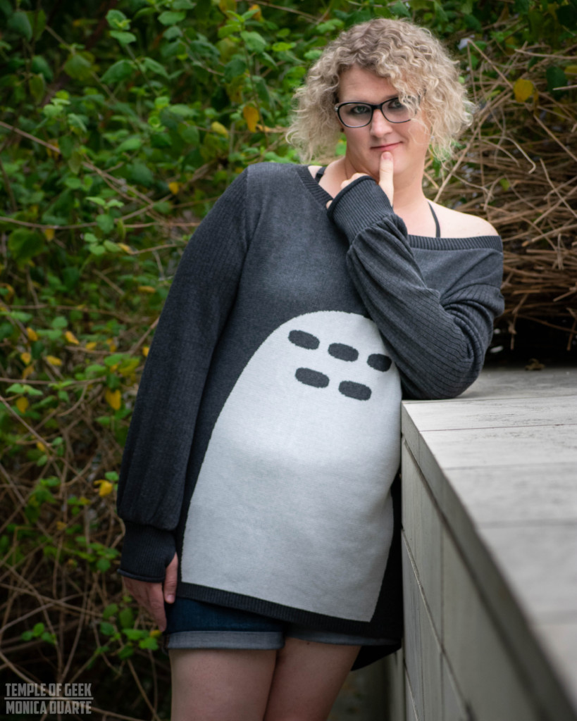 Whenever I hear the word “Oversized” I immediately think comfort. Oversized means I can crawl into it, live in it, and be me in it. That is exactly what this Totoro inspired sweater does. It is casual and fun and very comfortable. But it is intended to be worn loose and comfortably. My favorite thing about this sweater is the thumb hole. Makes you feel totally wrapped up in it.
