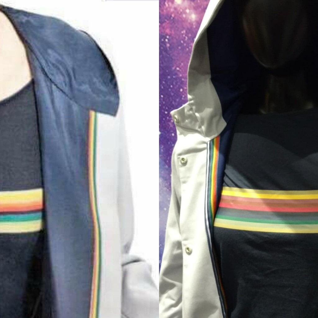 Front of the coat: The Her Universe coat does not have a seam on the left side of the coat, which leaves the left side ending at the rainbow stripe. There are buttons (snaps) added to the Her Universe coat which run from top to bottom that you don’t see on the screen accurate coat. We assume that the reason for this is that the Her Universe coat is meant to be functional and close completely, where the actual 13th Doctor coat is a costume and not meant to be functional. The rainbow pattern is definitely different but still recognizable as part of The Doctor’s wardrobe. Hood lining on the Screen Accurate coat runs to the very edge of the hood where the Her Universe coat has about a two inch seam from the edge.