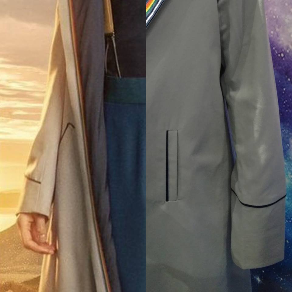 Pockets: Pockets are a different style and design with the HU coat running vertically and the SA coat angled about 45°. Piping on the SA coat runs around the outside of the pocket where the HU coat runs on the back edge of theirs. We have no idea yet if the SA coat will have an inside pocket the way the HU coat does, but as the previous four incarnations of the Doctor had inside pockets, we don’t see why the 13th Doctor wouldn’t.