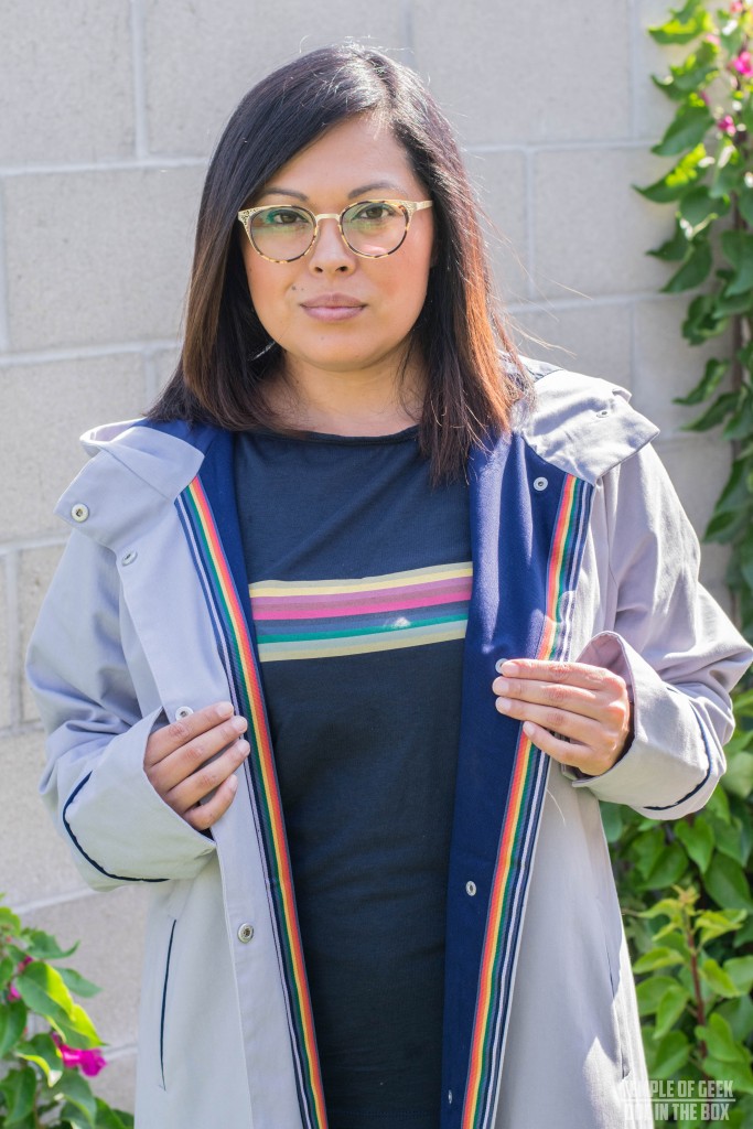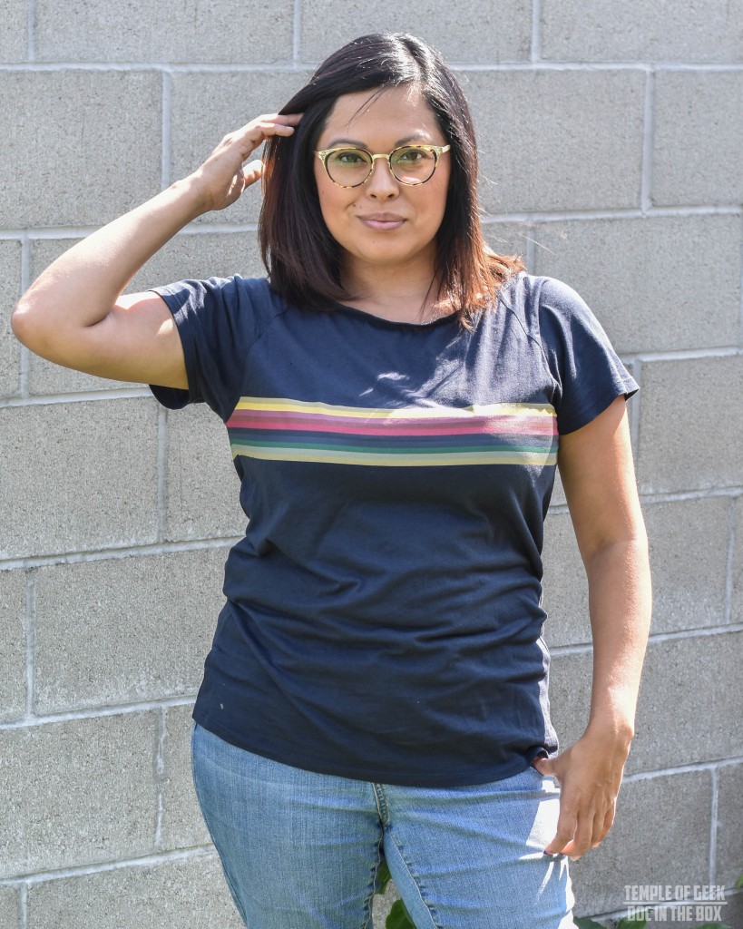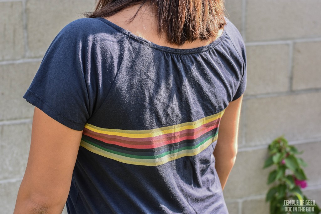The rainbow top is soft and comfortable. I really appreciate that the rainbow stripe goes all the way around the back. The only concern I have about this top deals with the neckline. The collar appears to be ruched a little at the seam. I don’t know if that is intentional or not. It is a small detail, but something I noticed. The scoop neck hangs a little higher than the shirt worn by Whittaker in the promotional images. But like I stated before, this is meant to be an everyday representation of our fandom and not a screen accurate cosplay. But even then as far as screen accurate goes, this comes really really close. I wore it un-tucked in the photos to give readers a better idea of the length of the shirt. On the show it is worn tucked in.