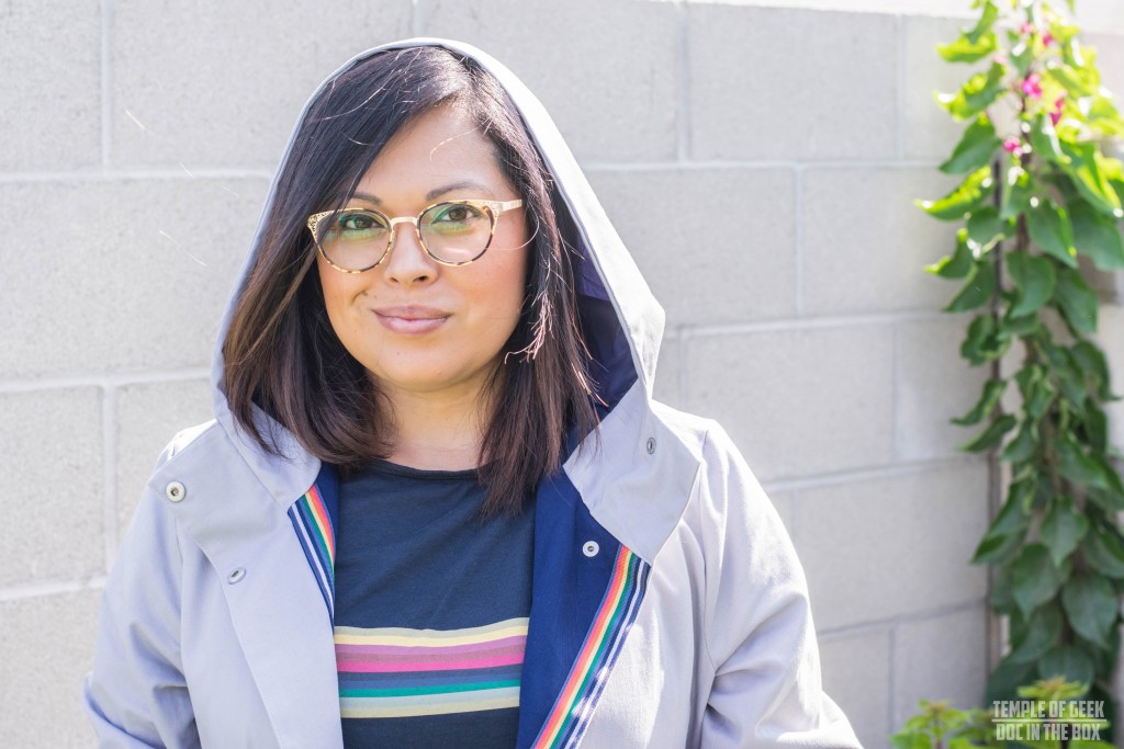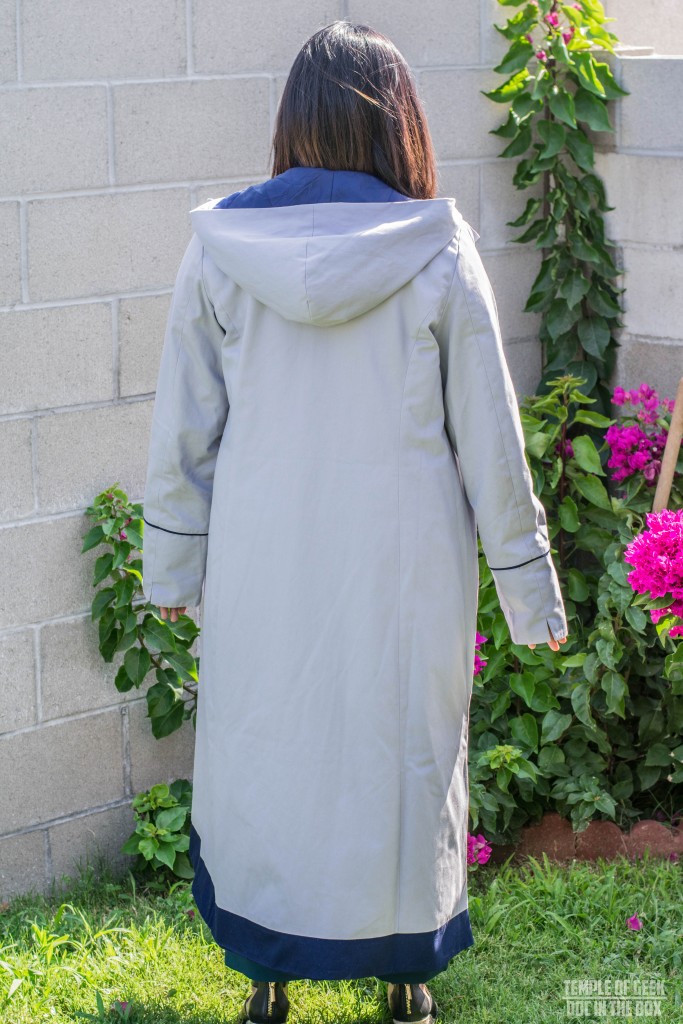 The hood is wide and loose. If you pull it all the way over your head it comes down to just above the brow line. The color of the coat is a soft blue-ish gray. It almost looks beige in certain lights. Jodie describes this being inspired by the color of the sky that she fell through when she was thrown out of the TARDIS in the Christmas special. Overall I think it is a great coat for the fall weather and a great everyday coat. The thing that I appreciate most about the coat is that it is subtle in it’s design, and the color scheme is soft and can be worn with a wide variety of outfits. It is a great piece of incognito geek wear. It is also Time Lord approved as it was worn on the runway of the Her Universe Fashion Show by the 13th Doctor herself!